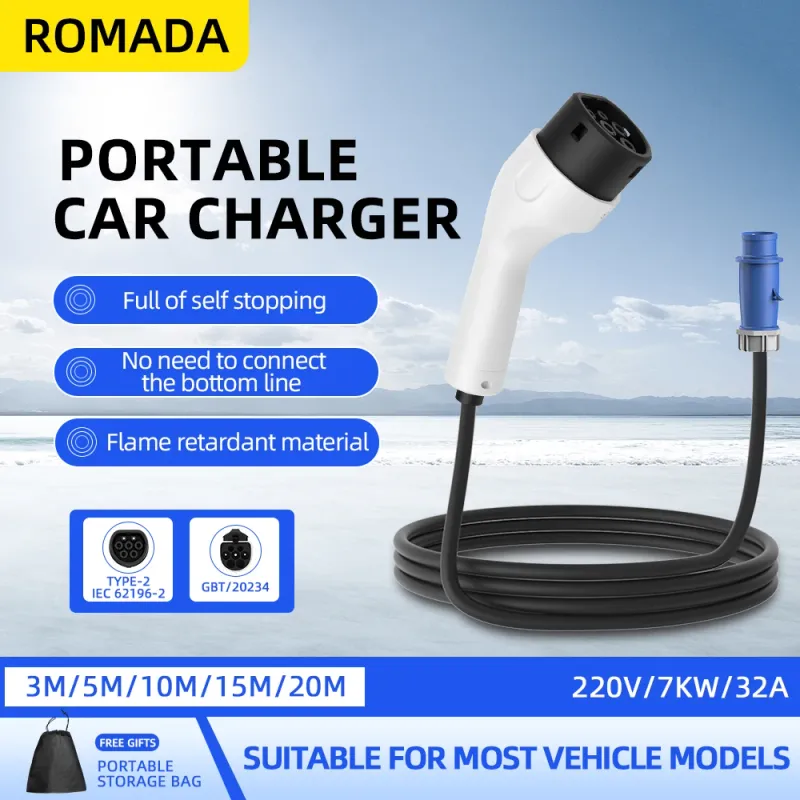 ROMADA Type2 IEC62196-2 For Electric Vehicle 7KW 32A EV Portable Charger 3M 5M 10M 15M 20M Cable EVSE CEE Plug Wallbox Adapter