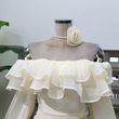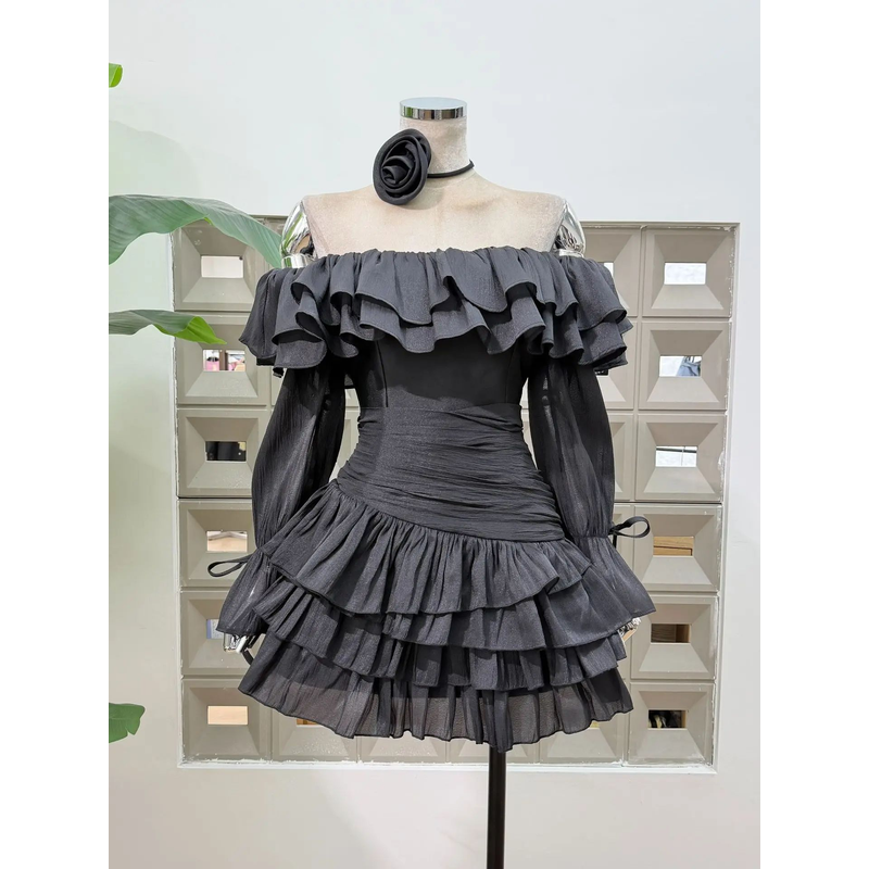 With its strapless silhouette and tiered decoration, this dress combines sexy allure with sophisticated elegance.