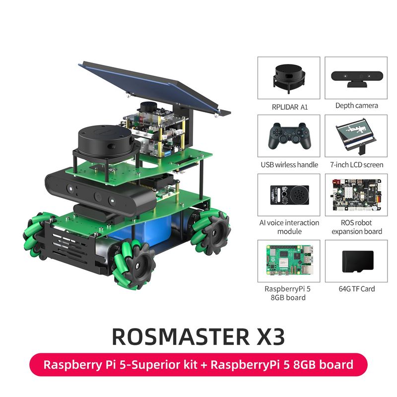 • ROSMASTER X3 is an educational robot based on the robot operating system with Mecanum Wheel, compatible with Jetson NANO/Orin NX SUPER/Orin NANO SUPER and Raspberry Pi 5. It is equipped with lidar, depth camera, voice interaction module and other high-performance hardware modules. Using Python programming, ROSMASTER X3 can realize mapping and navigation, following or avoiding, Autopilot and human body posture detection. It support APP remote control, APP mapping navigation, handle remote control, ROS system PC control and other cross-platform remote control methods. We provide 103 video courses and a large number of codes, which can allow users to learn artificial intelligence programming and ROS systems.