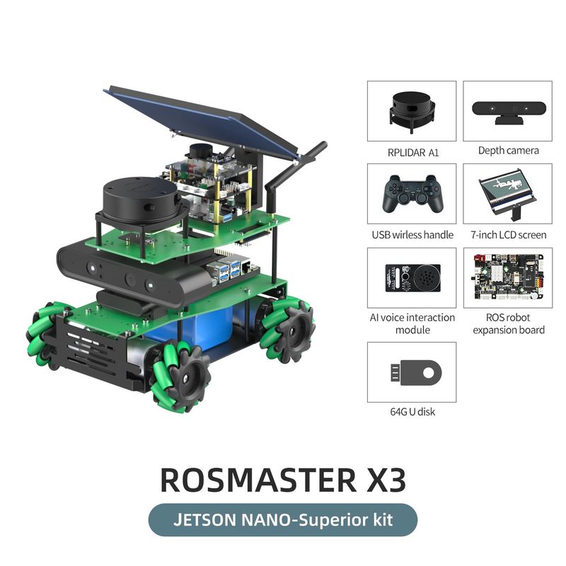 • ROSMASTER X3 is an educational robot based on the robot operating system with Mecanum Wheel, compatible with Jetson NANO/Orin NX SUPER/Orin NANO SUPER and Raspberry Pi 5. It is equipped with lidar, depth camera, voice interaction module and other high-performance hardware modules. Using Python programming, ROSMASTER X3 can realize mapping and navigation, following or avoiding, Autopilot and human body posture detection. It support APP remote control, APP mapping navigation, handle remote control, ROS system PC control and other cross-platform remote control methods. We provide 103 video courses and a large number of codes, which can allow users to learn artificial intelligence programming and ROS systems.