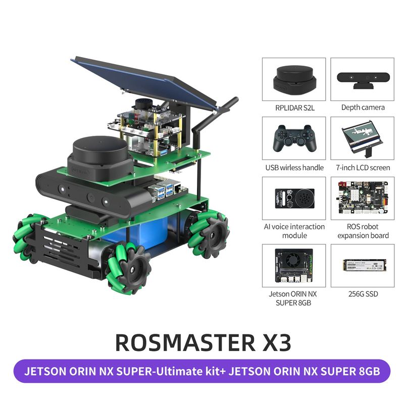 • ROSMASTER X3 is an educational robot based on the robot operating system with Mecanum Wheel, compatible with Jetson NANO/Orin NX SUPER/Orin NANO SUPER and Raspberry Pi 5. It is equipped with lidar, depth camera, voice interaction module and other high-performance hardware modules. Using Python programming, ROSMASTER X3 can realize mapping and navigation, following or avoiding, Autopilot and human body posture detection. It support APP remote control, APP mapping navigation, handle remote control, ROS system PC control and other cross-platform remote control methods. We provide 103 video courses and a large number of codes, which can allow users to learn artificial intelligence programming and ROS systems.