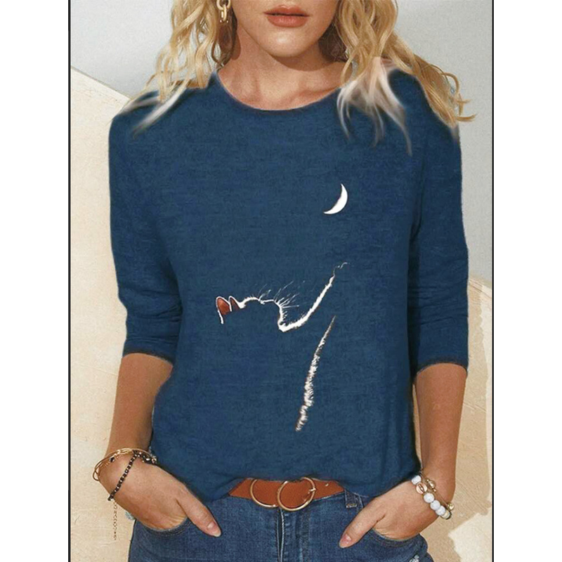 Round Neck Printing Long-sleeved Casual Top T-shirt Women BLUE B L