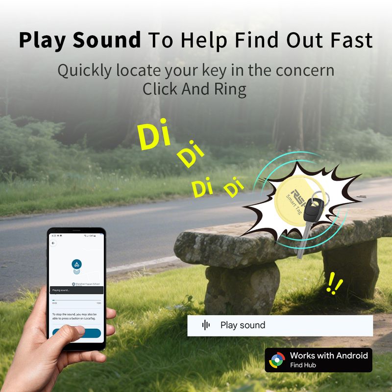 Find Nearby Tracker Tag With Sound: Within Bluetooth range (up to 60-150 m), you can check the location and easily find your item by activating sound via Google Find Hub/ Find My app or voice commands. The tracking tag will ring loud enough to help you locate it.
