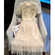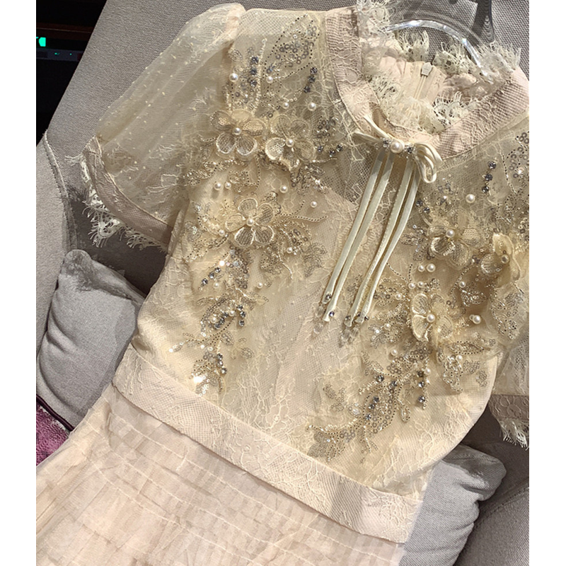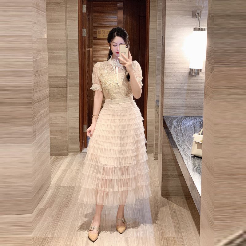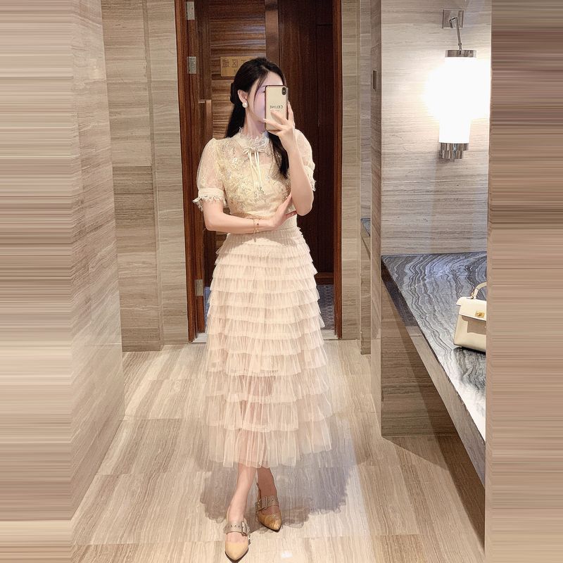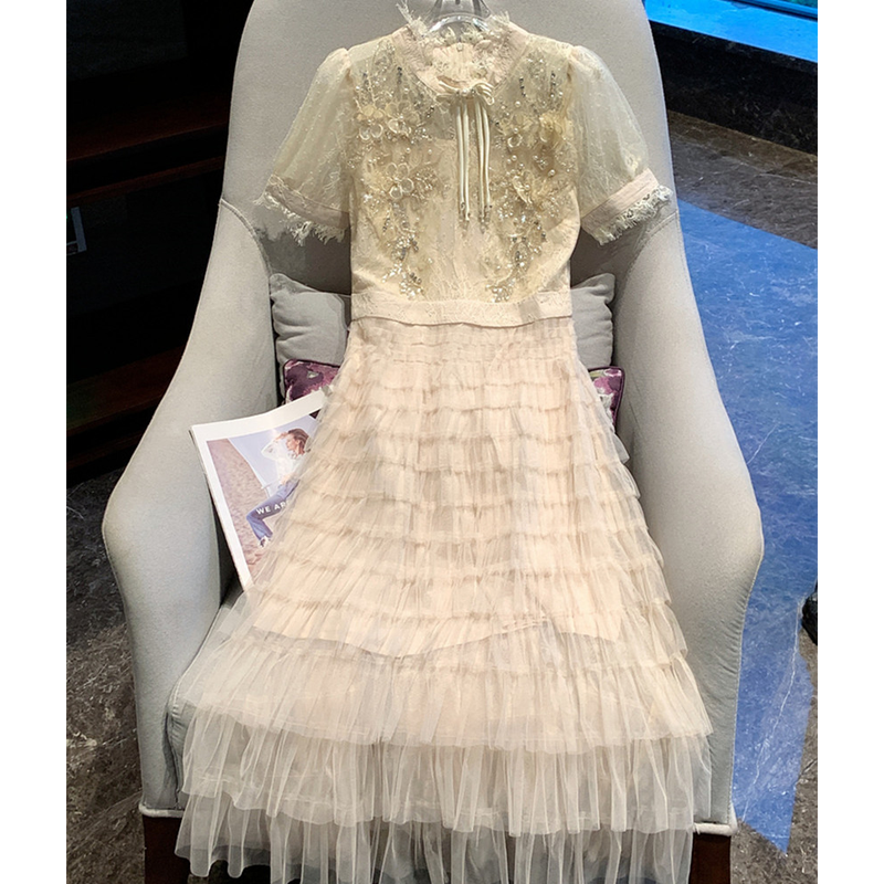 Runway Fashion Summer Mesh Lace Patchwork Cake Party Dress Women Stand Collar Pearls Beaded Sequin Layers Ruffles Long Vestidos