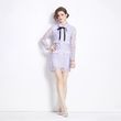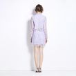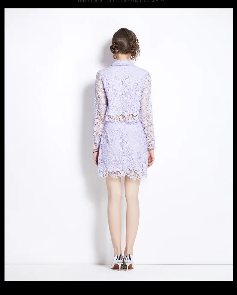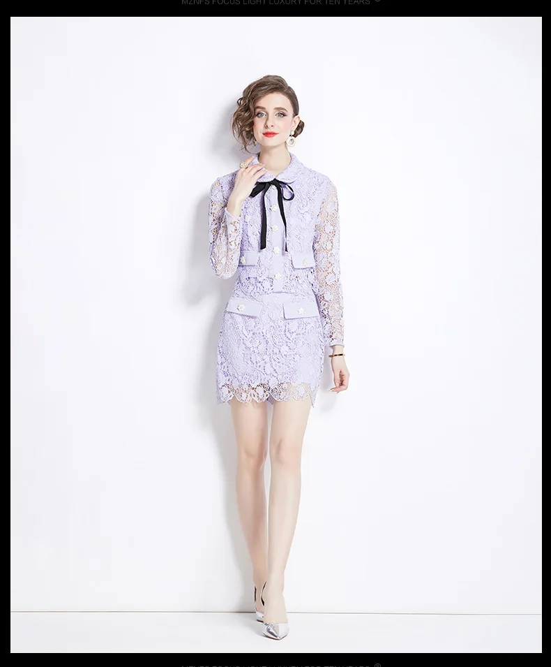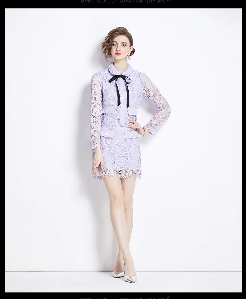 Runway Summer Pruple Lace Two Piece Set Elegant Women Doll Collar Lace Up Bow Beaded Button Hollow Out Tops + Mini Skirt Suits