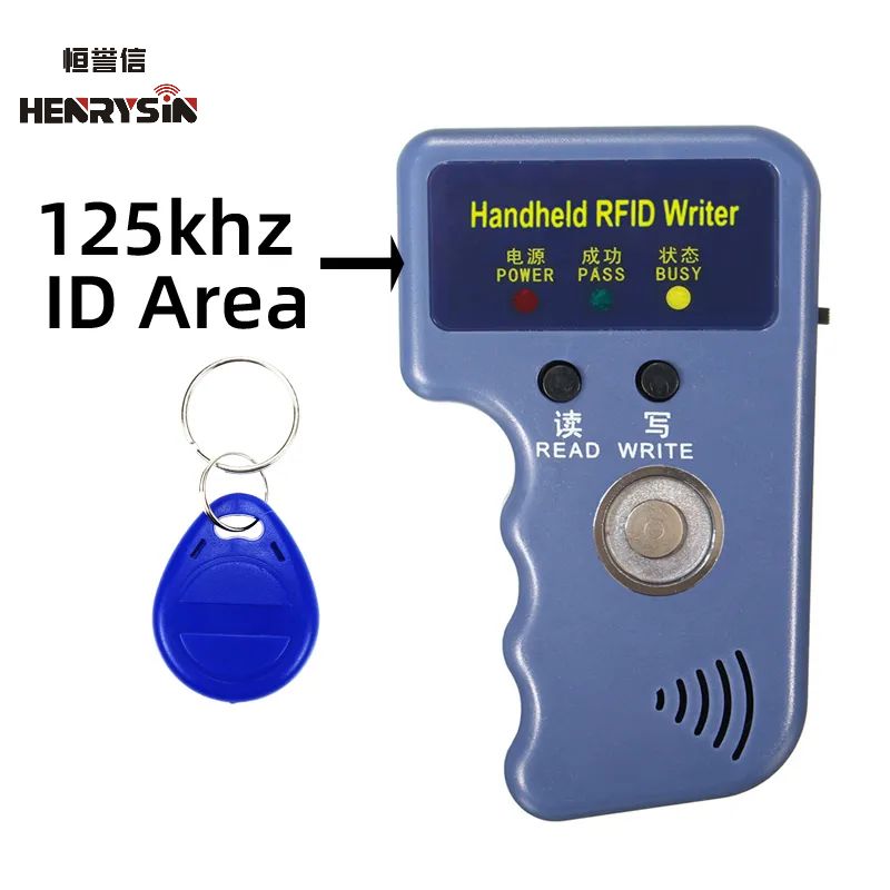 Read: Put the inductive proximity card (EM4100 or TK4100 or has inside info EM4305 or T5577) in the ID area and hold the read key (left one). The buzzer will sound emitted by the green indicator for success. If the power light is only blinking, then the card reader failed, the reason may it's the key chip is not the supportable type key chip.