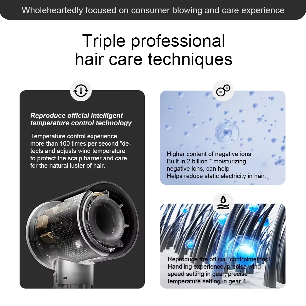 Temperature control experience,more than 100 times per second "de-tects and adjusts wind temperatureto protect the scalp barrier and carefor the natural luster of hair.