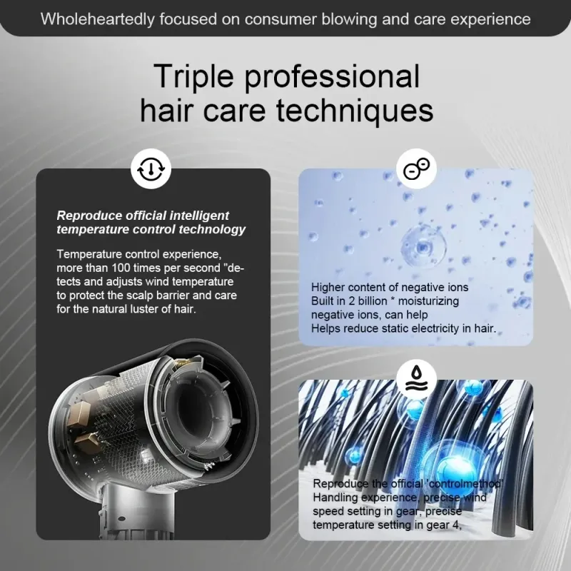 Temperature control experience,more than 100 times per second "de-tects and adjusts wind temperatureto protect the scalp barrier and carefor the natural luster of hair.
