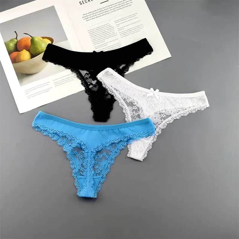 S M L XL XXL Plus Size Sexy Cozy Lace Cotton Thongs Underwear Lingerie for Women Seamless T-back Ladies Transparent G-string 3PC