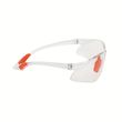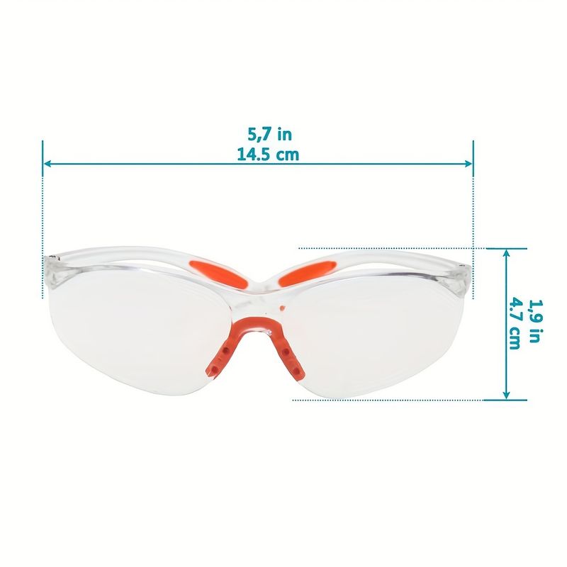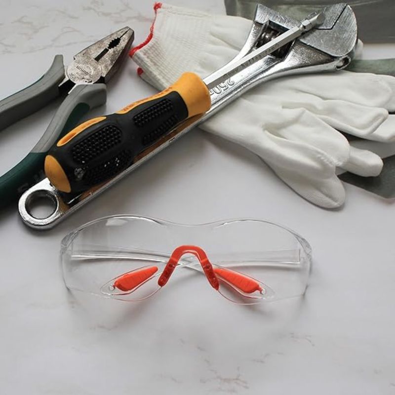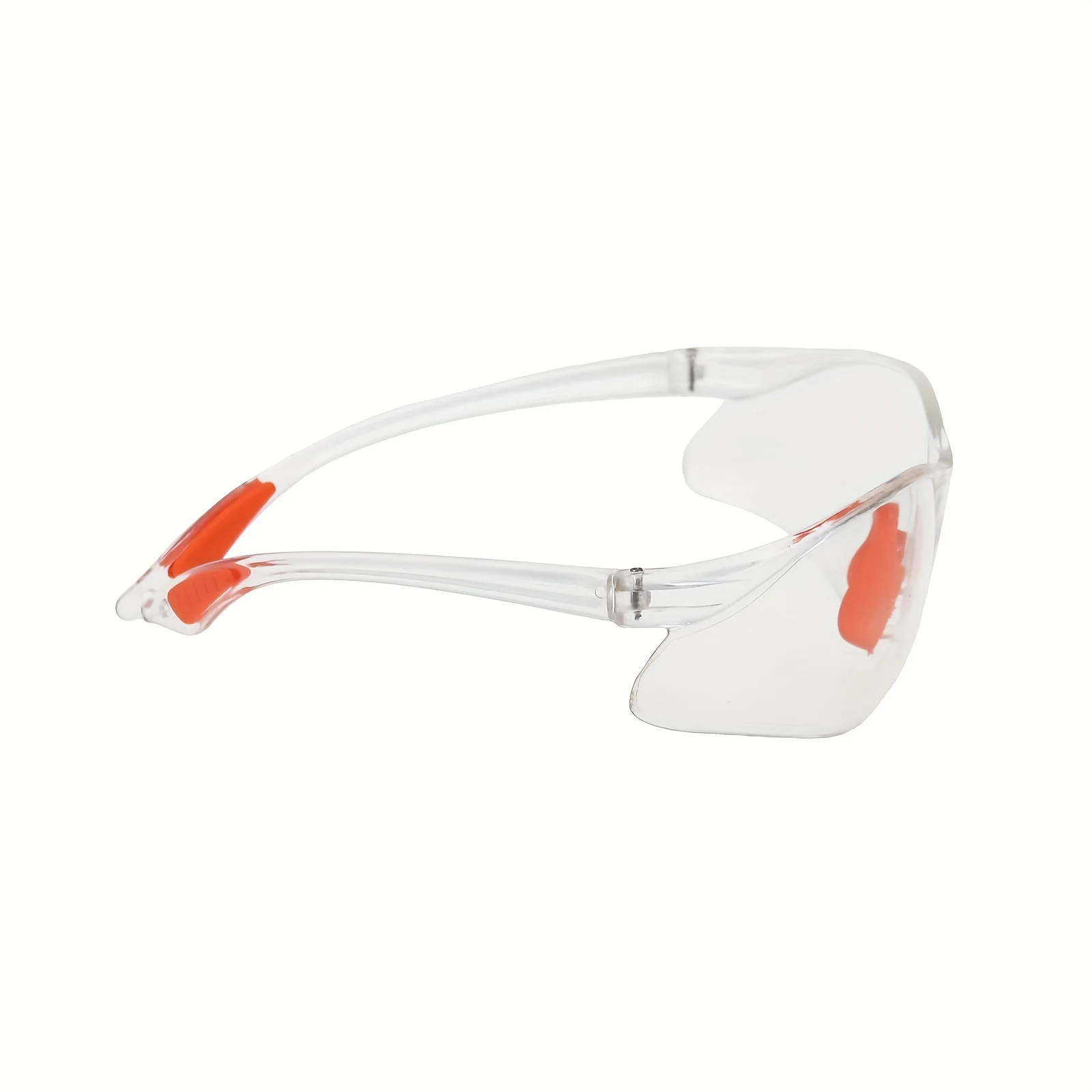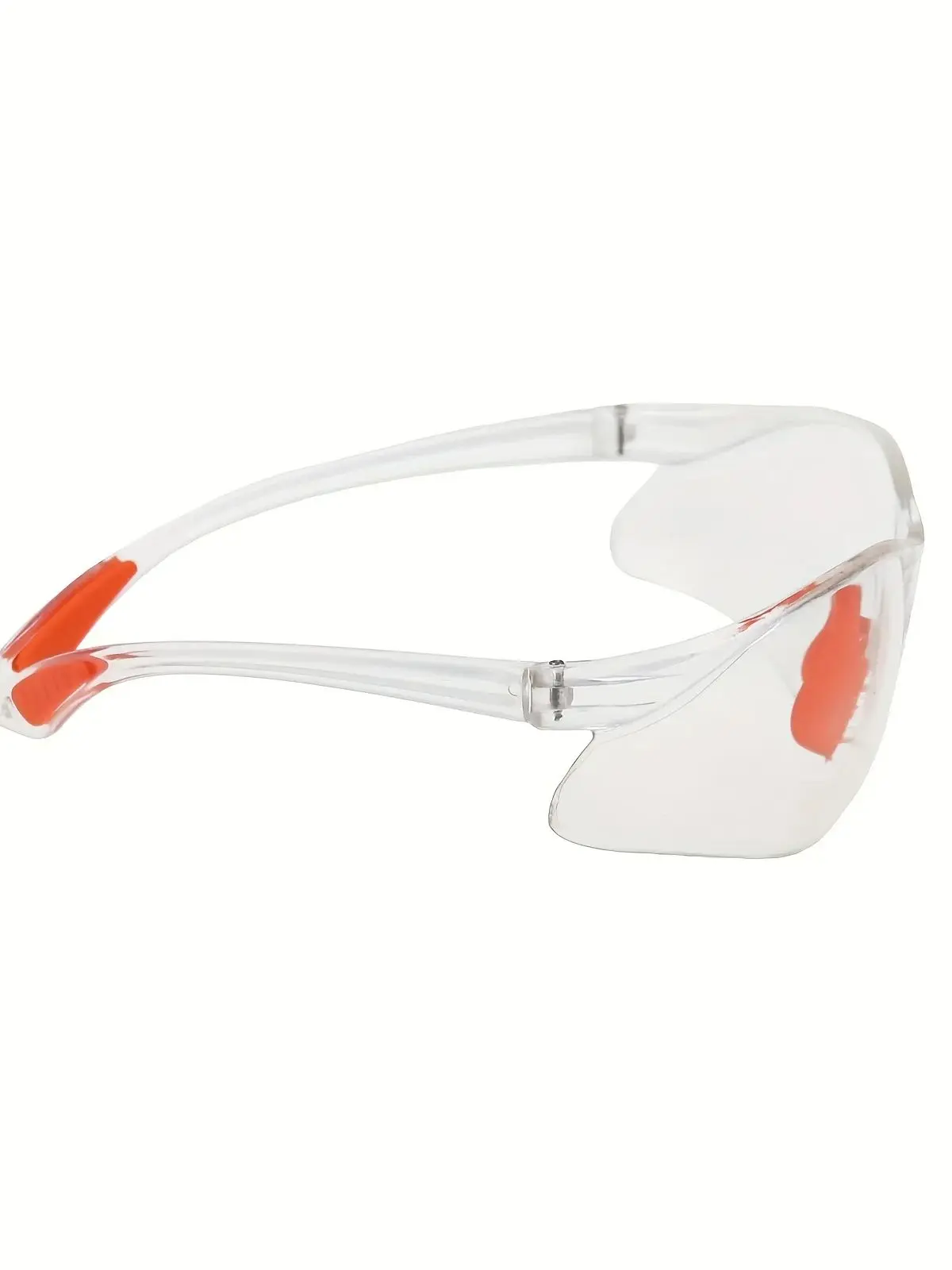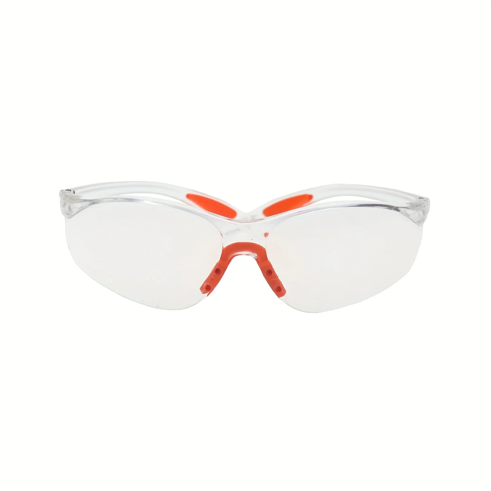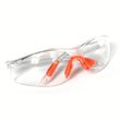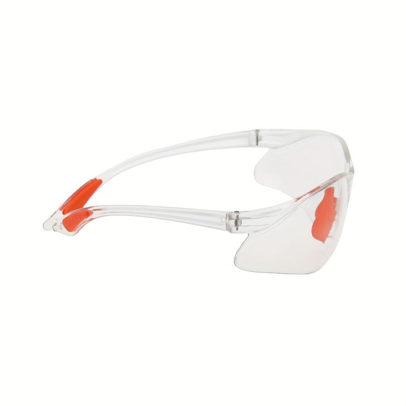 -Protective eyewear is made from hard, clear acrylic plastic with clear, untinted lenses.Glasses feature bright orange rubber nose and padded ear grips making them comfortable to wear and giving them a secure fit.