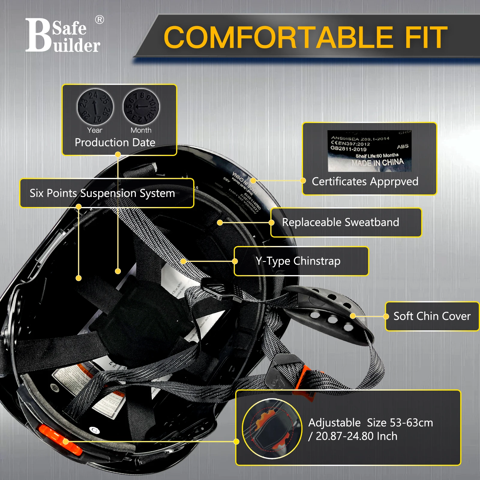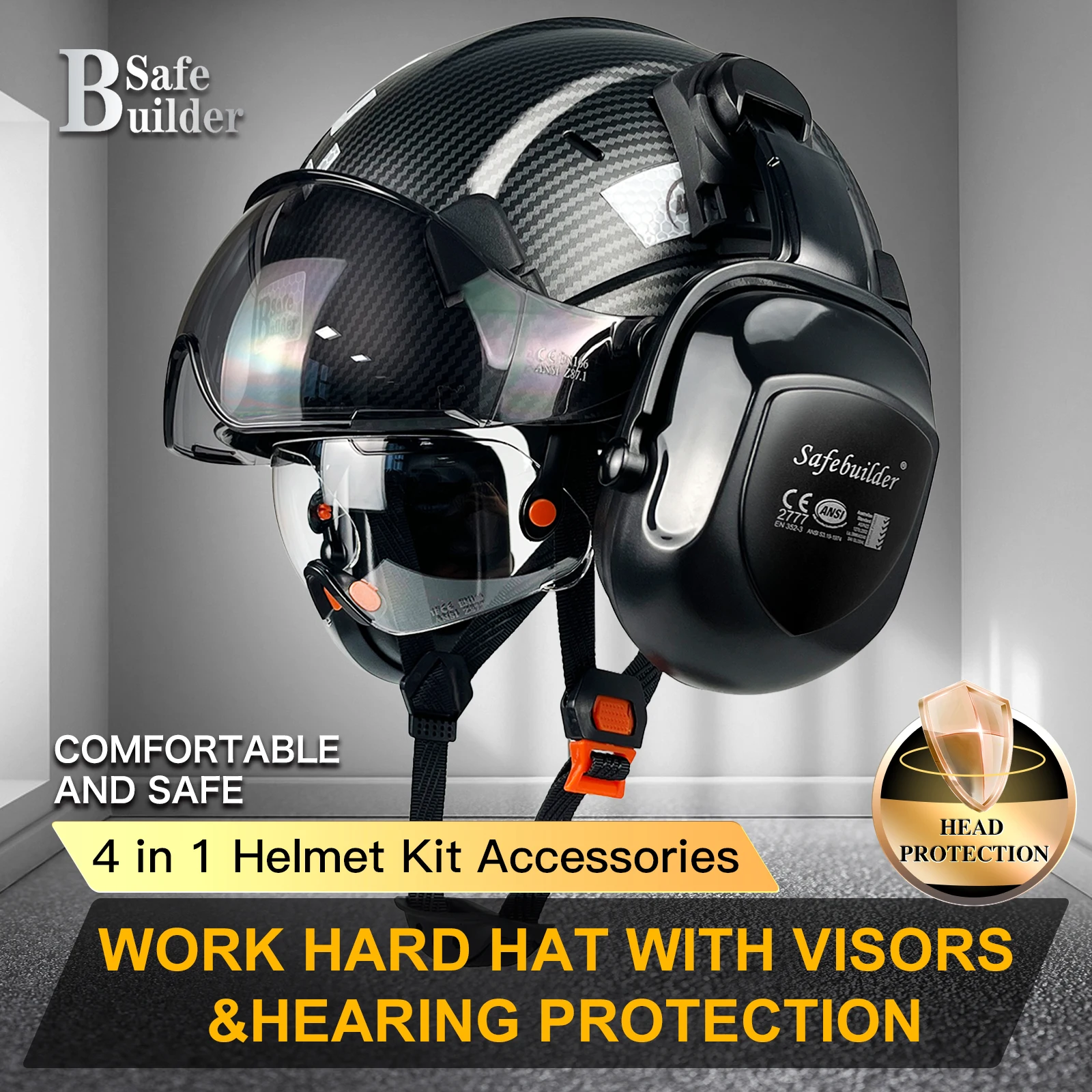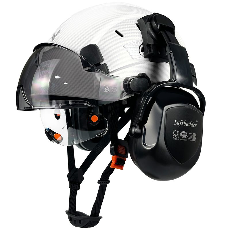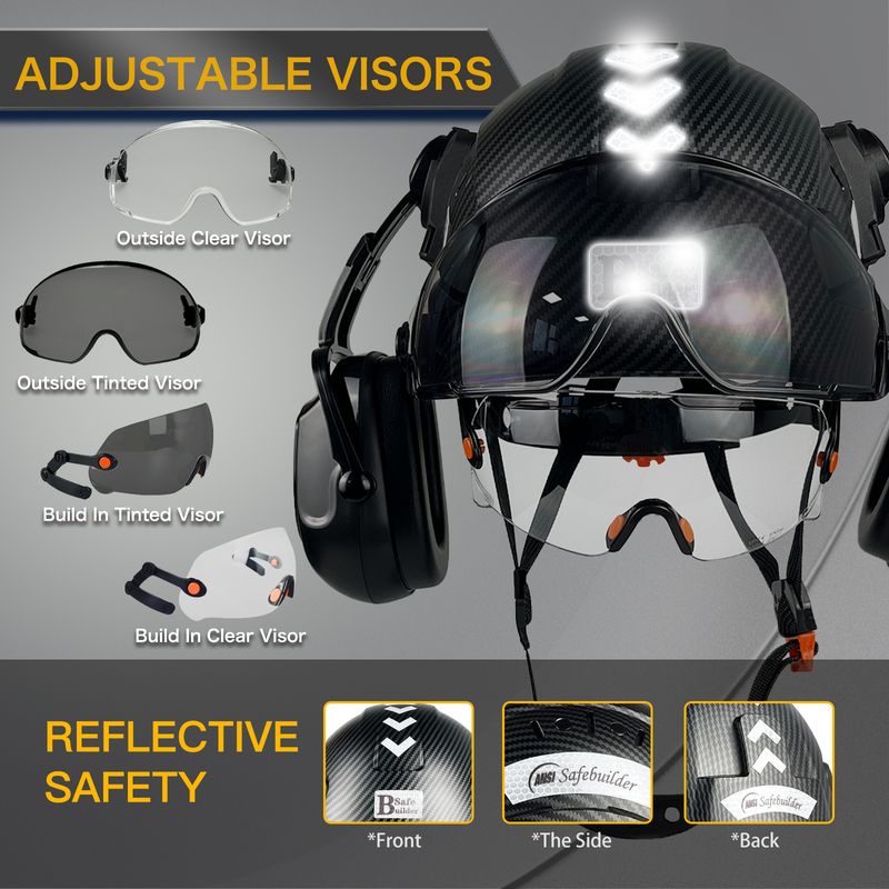 【Accessories 】 Safety Hard Hats Support Ear Muffs mounted to get Hearing Protection, Safety Visor installed Inside & Outside of Hat Shell ,Clear visor & Tinted Visor for choices help workers get Clear vision In Daily work or at Night. Choose Safebuilder Choose a full set Head Protection