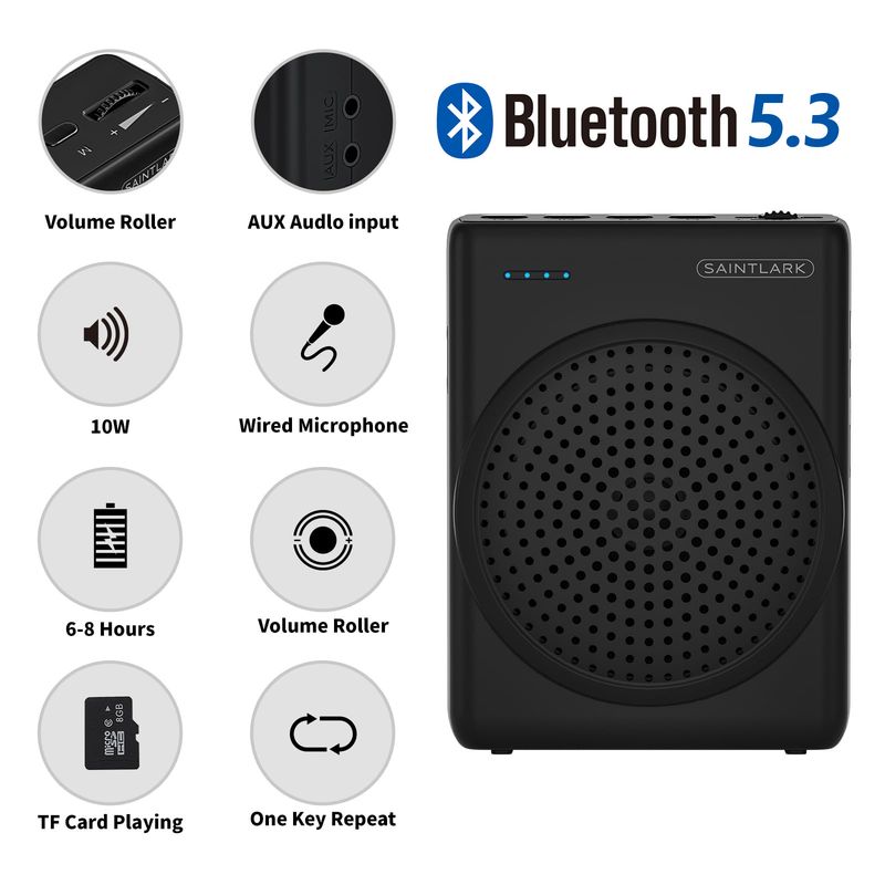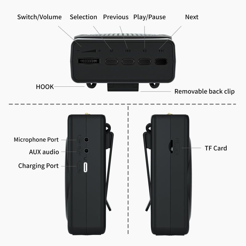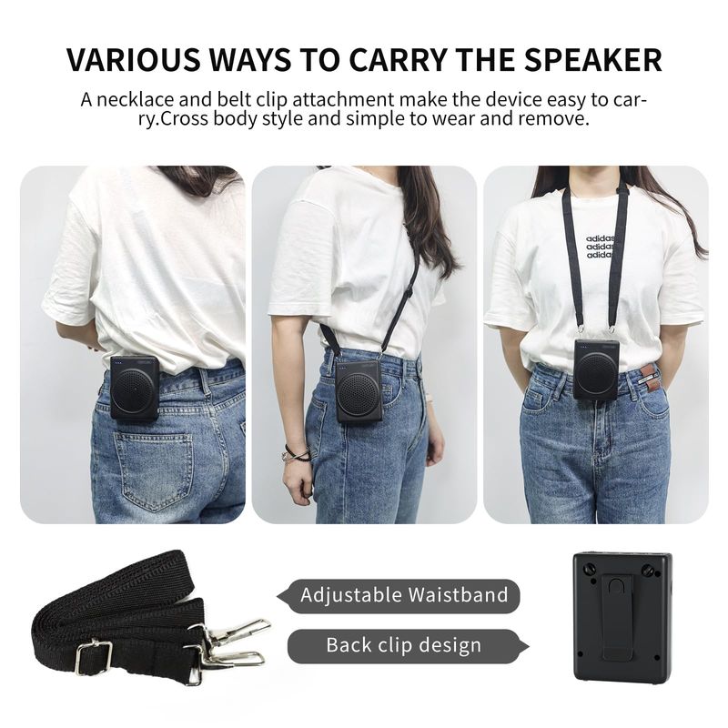 Voice amplifier can be used with the help of a belt hanging around the neck or tied around the waist, support for TF card playback , repeat playback of a single song, loop playback of all the music and switching songs.