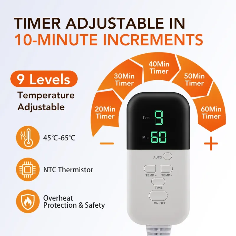 9 Temperature Settings: 45-65°C (adjust via + and - buttons based on comfort)