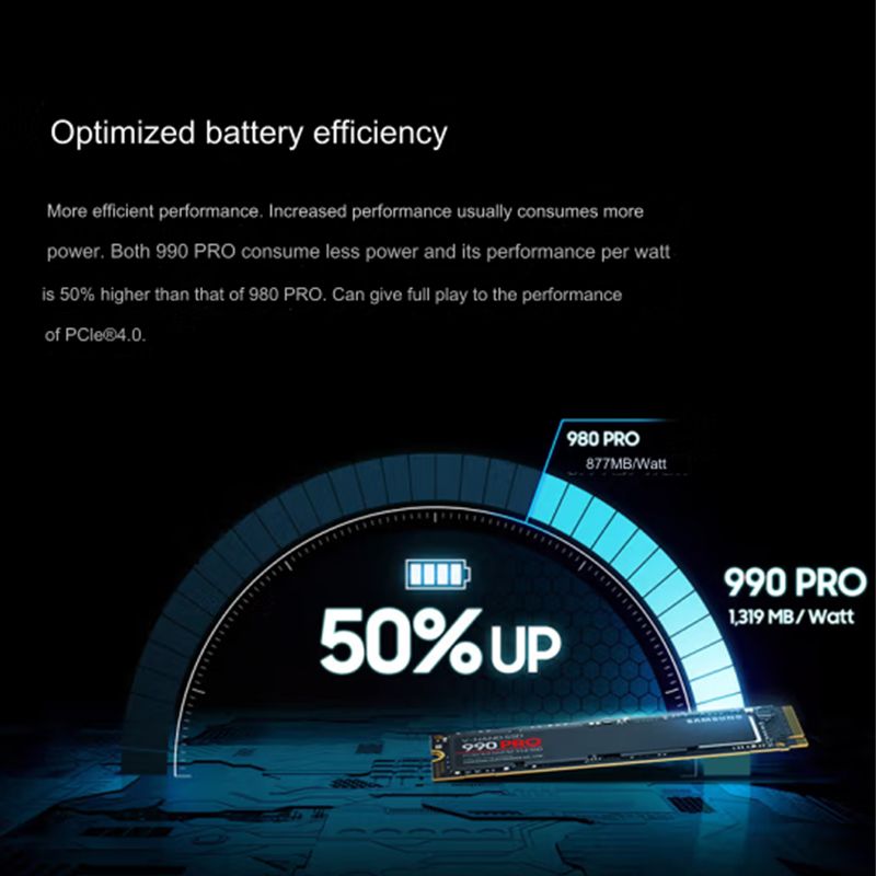 The 990 PRO M.2 SSD operates without a cooling fin, ensuring efficient heat dissipation and prolonged device lifespan.