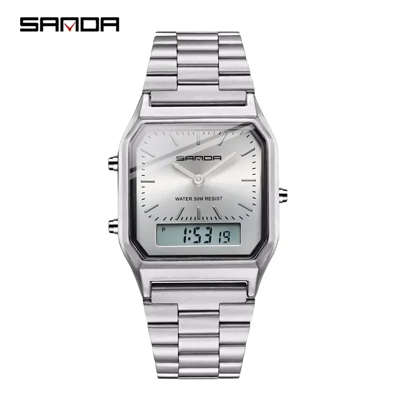 SANDA P747 Dual Display Clock Unisex Waterproof Sports Quartz Watch Luxury Mens Style Watches Stainless Steel Women LED Digital