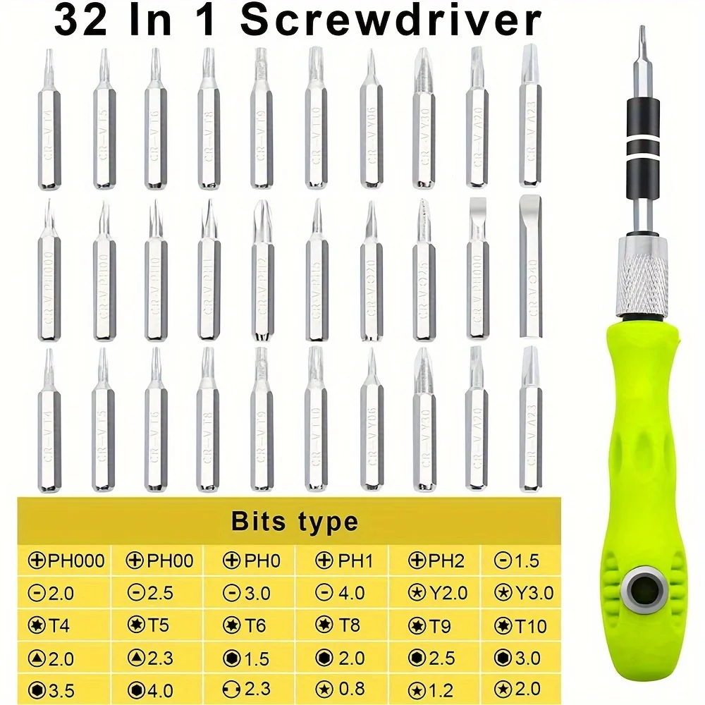 32 Piece Set - This comprehensive bit set with a comfortable, non-slip coated handle and long extension allows you unlimited use. In our set you will find all common bits including: 5 x Philips, 5 x Flat, Torx in sizes T4 to T10, Hex from H1.5 to H4.0, Y in sizes 2.0 and 3.0, triangular 2.0 and 2.3, 3x pentalobe and 2.3mm U.