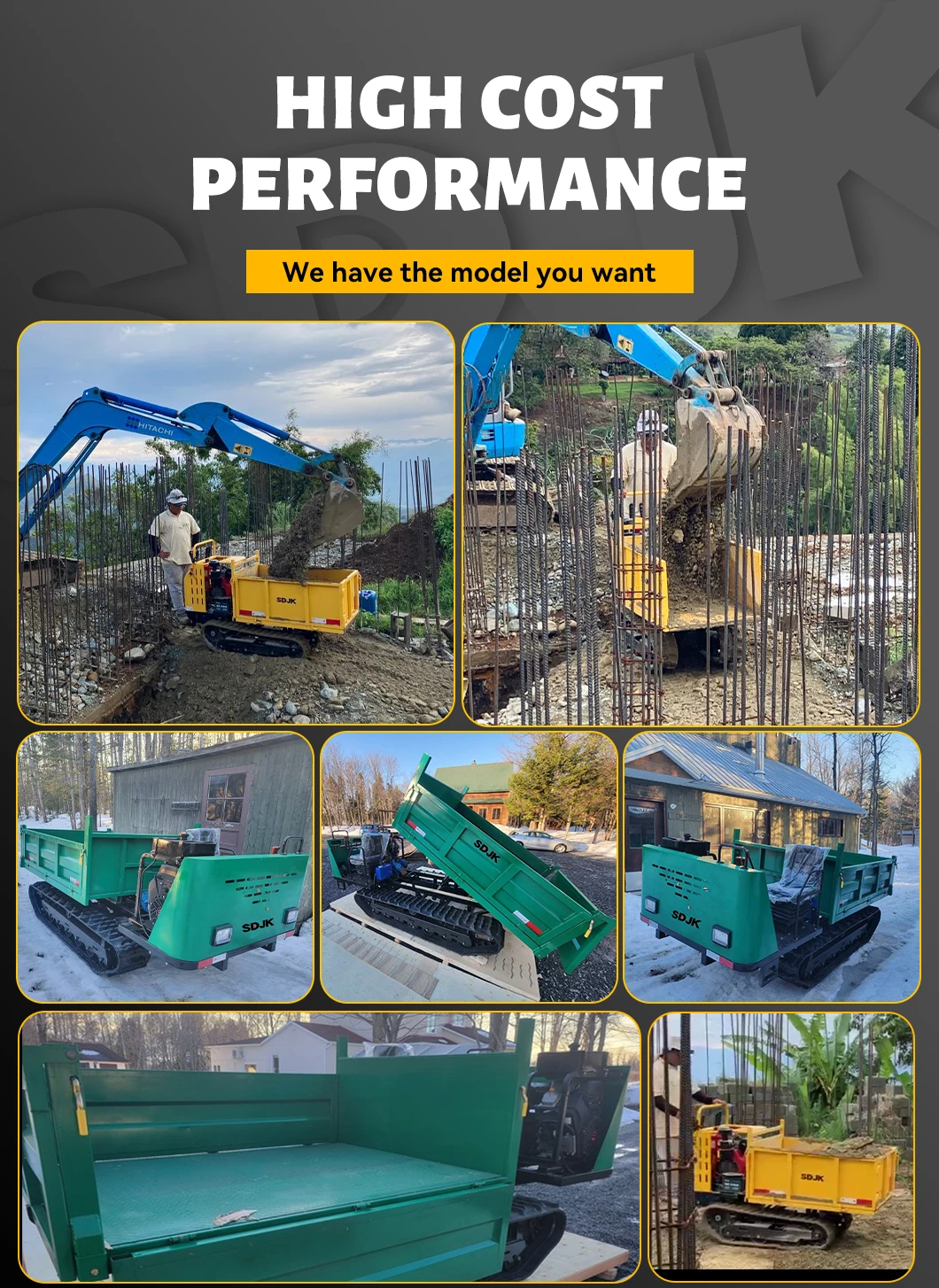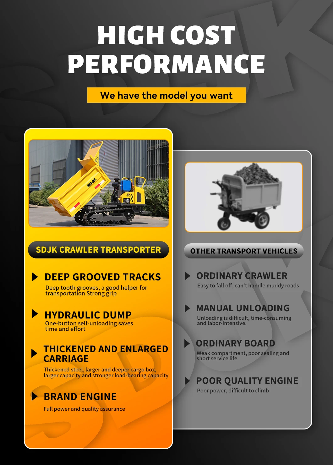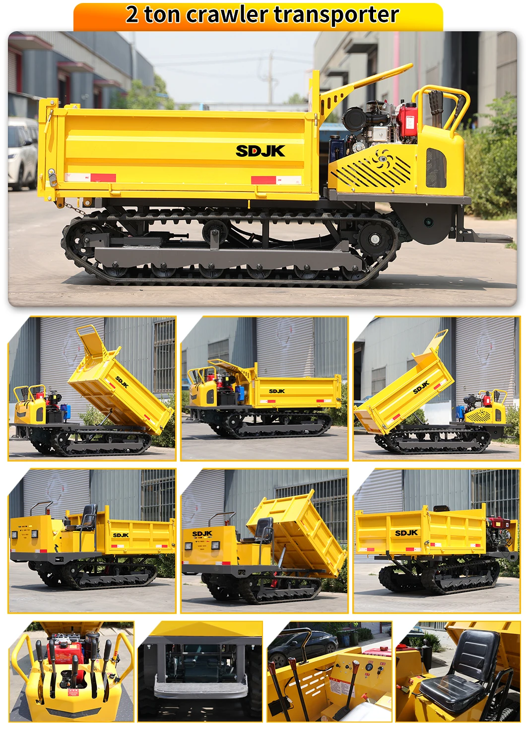 It is suitable for easily transporting large items, crops, sand, and other objects that are difficult to transport manually in a narrow space. This machine is simple to operate, controlled, and standardized design makes the operation not only fast and cost-saving, but also has excellent climbing ability, especially for hard work. It is characterized by rubber crawlers and firm swing rollers to ensure that the operator operates smoothly during transportation, Effortless, and minimize the damage to the ground.