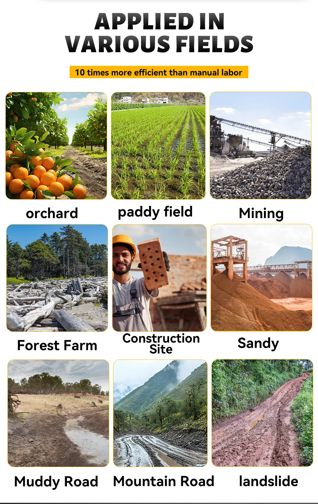 2.It can be used in all-terrain working environment, and it can still be unobstructed in rainforest and muddy roads. It is a good helper for your transportation. The maximum slope is 45°.