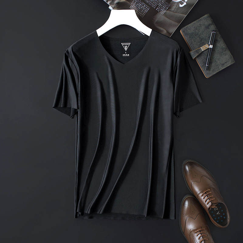 Seamless Cooling Japanese Goat Milk Men's Technology Lightweight Ice Silk V-Neck Short-Sleeved T-Shirt European And American Simple Slim Shirt Black 2XL