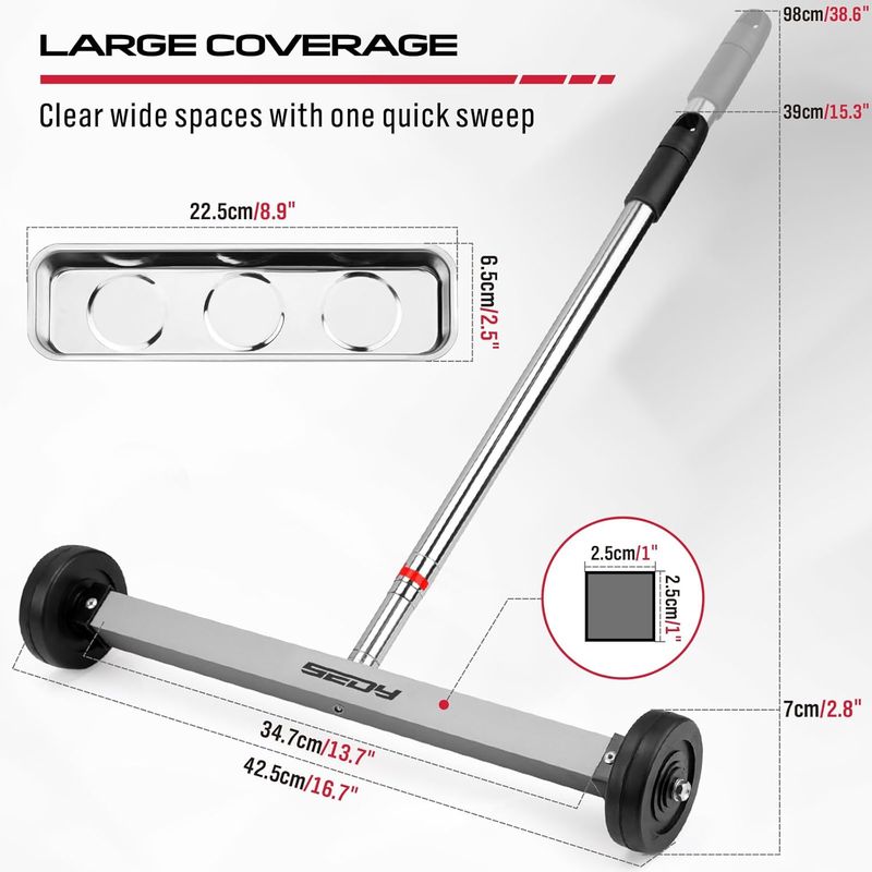 Keep your workshop, garage, yard, or driveway free from dangerous metal debris with our high-strength 17-inch Magnetic Sweeper. Designed for efficiency, comfort, and portability, this essential tool makes cleanup fast, easy, and back-friendly.