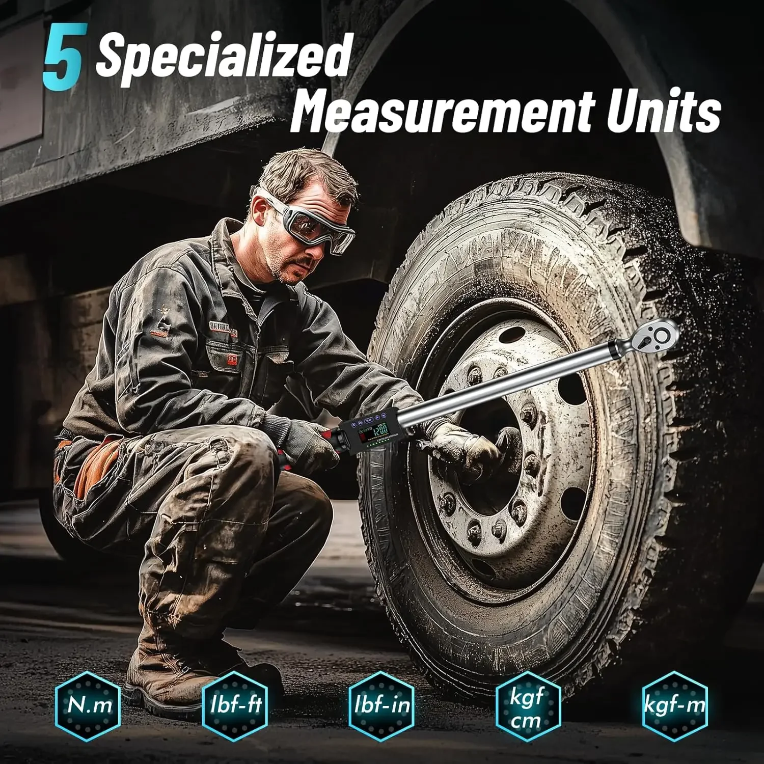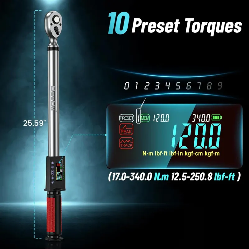 【±2% Accuracy】The 1/2" digital torque wrench offers adjustable torque from 12.5 ft-lbs to 250.8 ft-lbs(17-340N.m) with an accuracy of 2%, ensuring appropriate torque for your demanding tasks during vehicle maintenance or DIY, enabling precise control of torque
