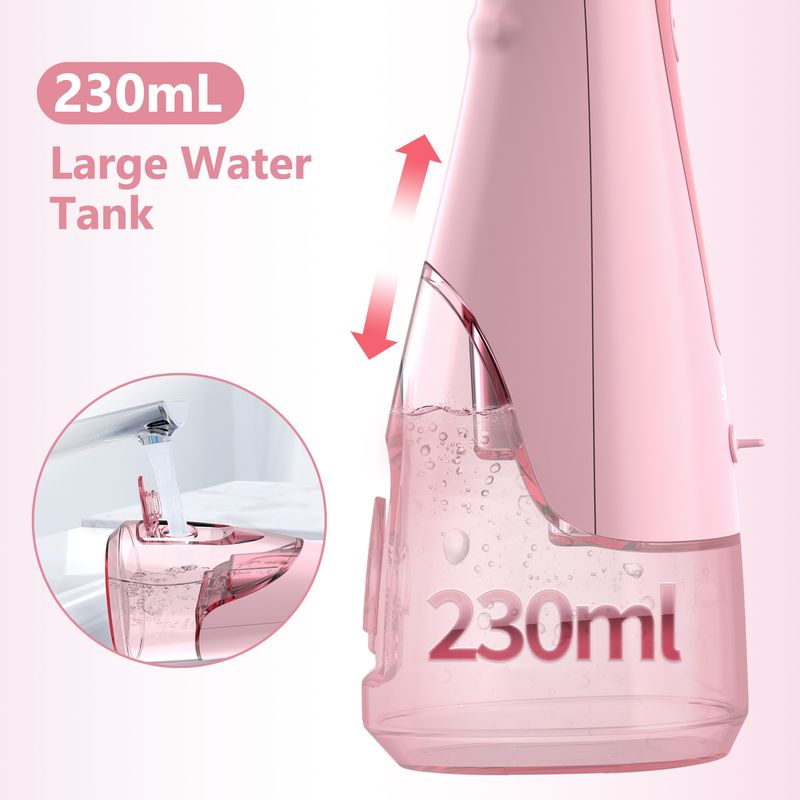 【270ML Detachable Water Tank】 The 270ml water floss tank design can satisfy a complete oral cleaning. allows for extended use without the need for frequent refilling, saving time and effort. Due to the open tank and removable design,our water floss is easier to clean than other. With easy-to-use operations, simply fill the tank and start your cleaning journey hassle-free