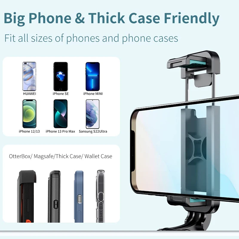 Adjustable phone holder and rotation angle: The phone clip is very easy to secure your phone. You can unfold two small cushions and extend the spring end of the clip to secure your phone, which is very sturdy and firmly holds your phone. The 225 ° rotating head allows you to find your preferred shooting angle by simply rotating the knob to better meet different needs.