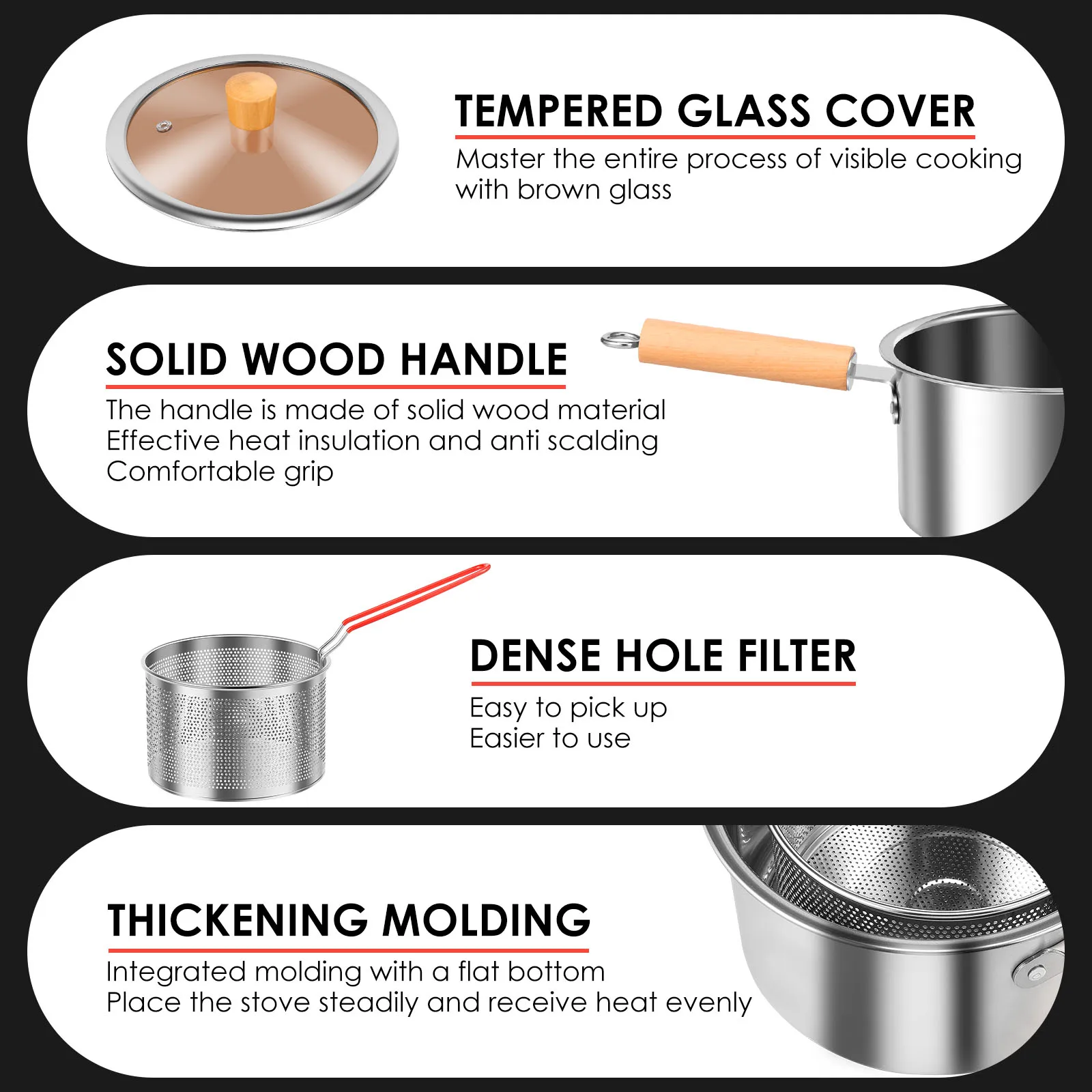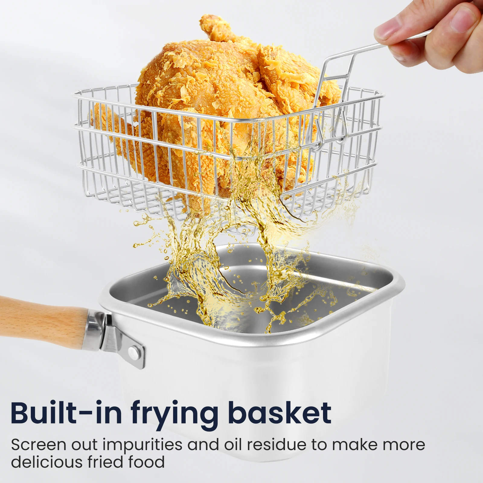 Quality Stainless Steel and Wood: This deep fryer is constructed of quality stainless steel, has good heat preservation, is sturdy, and long lasting. The handle uses quality wood, preventing it from heat and slipping