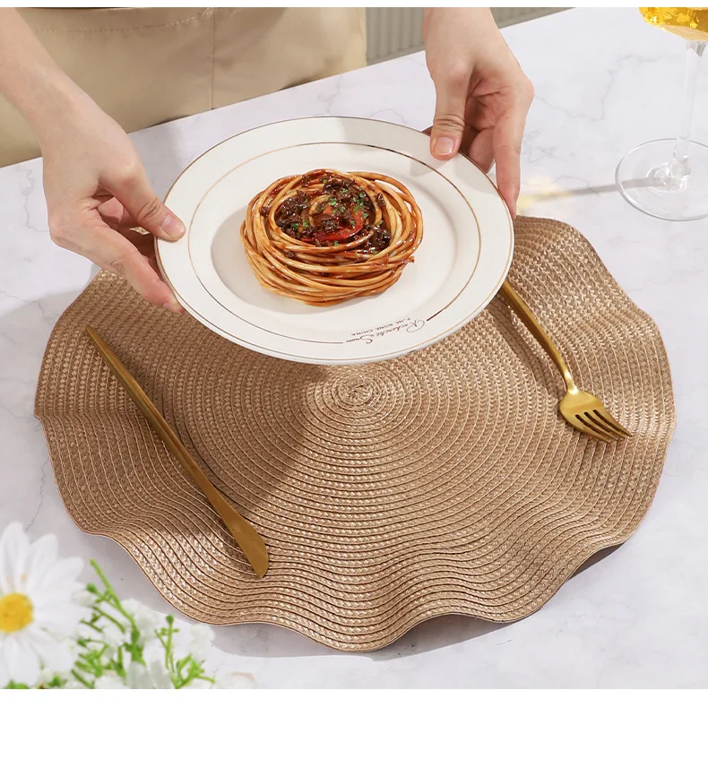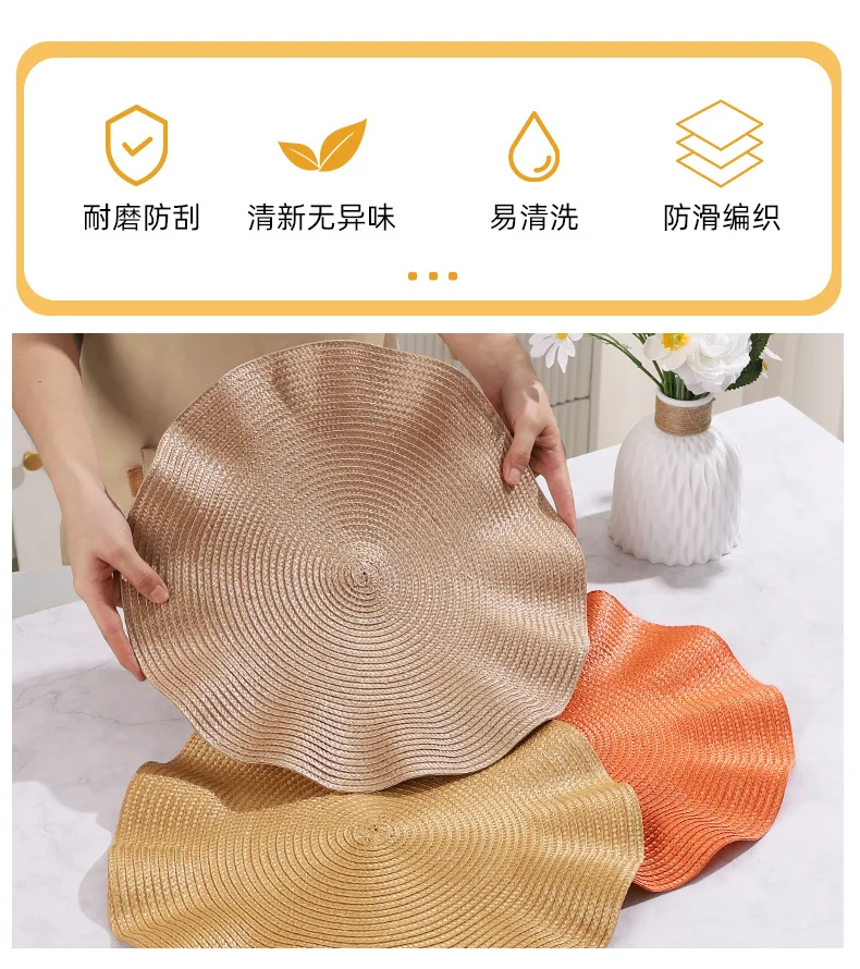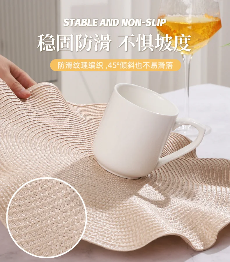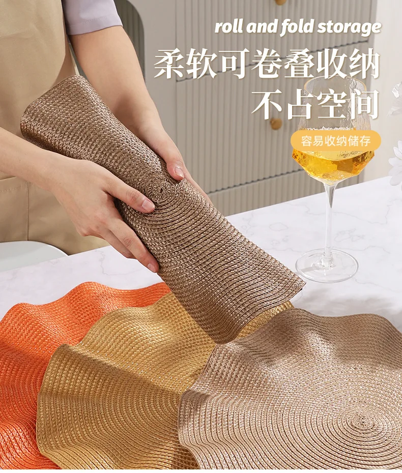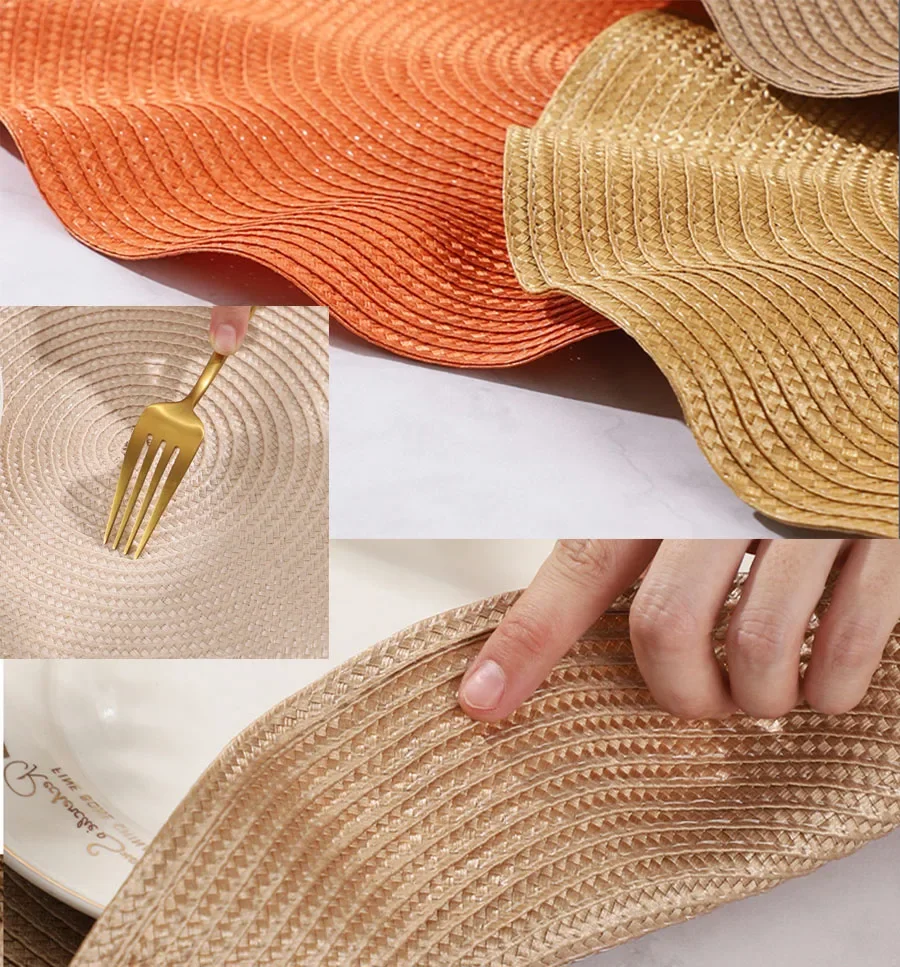 * Braided with Cotton Polyester Blend . Wrinkle resistant. Under light the clear wiring is a little shiny or glittery. 15 inch across, large enough for any plate or bowl.