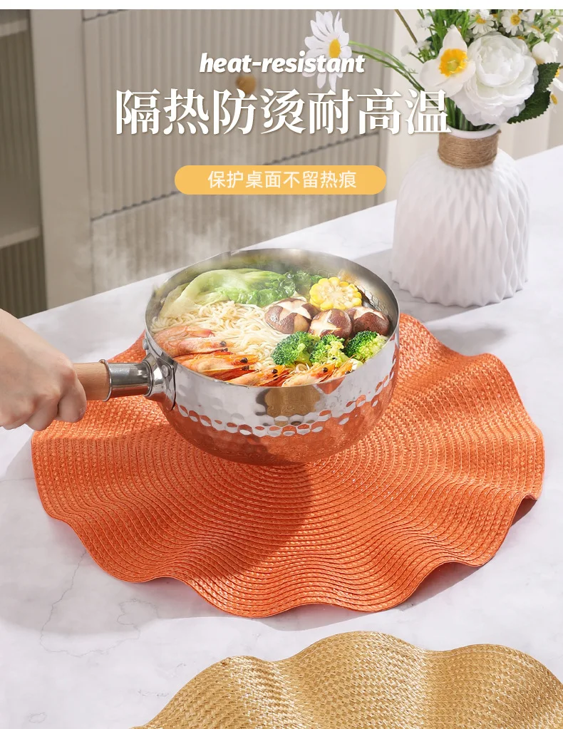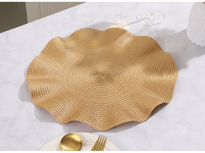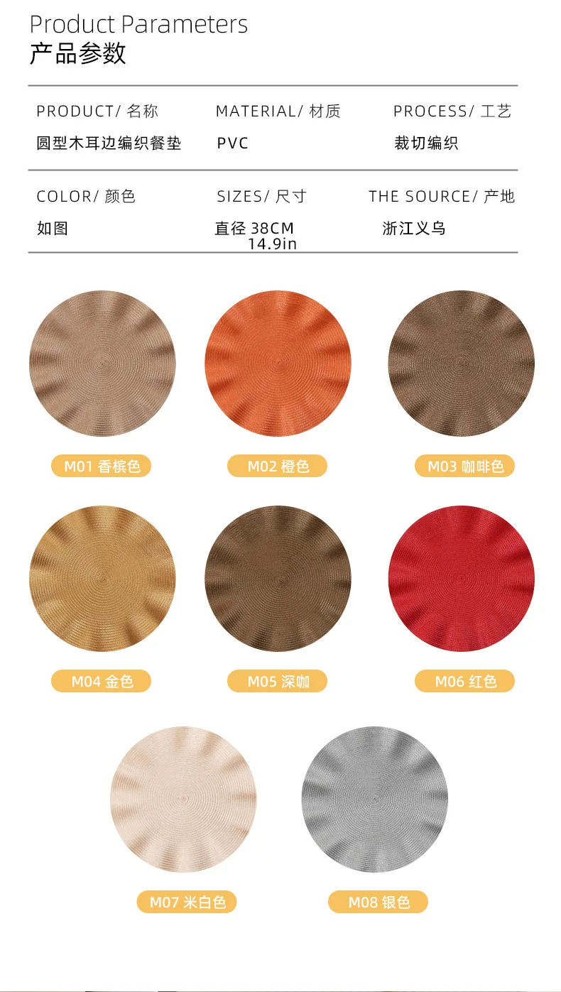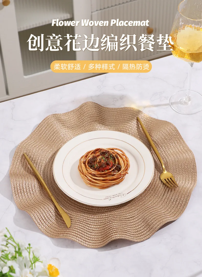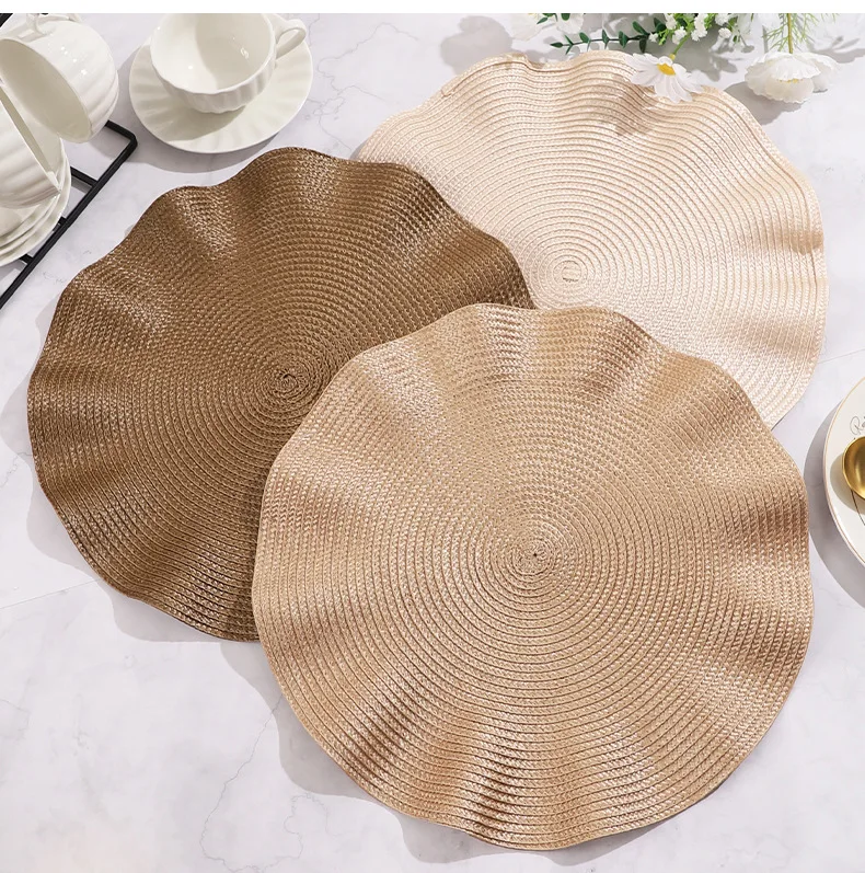 * Braided with Cotton Polyester Blend . Wrinkle resistant. Under light the clear wiring is a little shiny or glittery. 15 inch across, large enough for any plate or bowl.