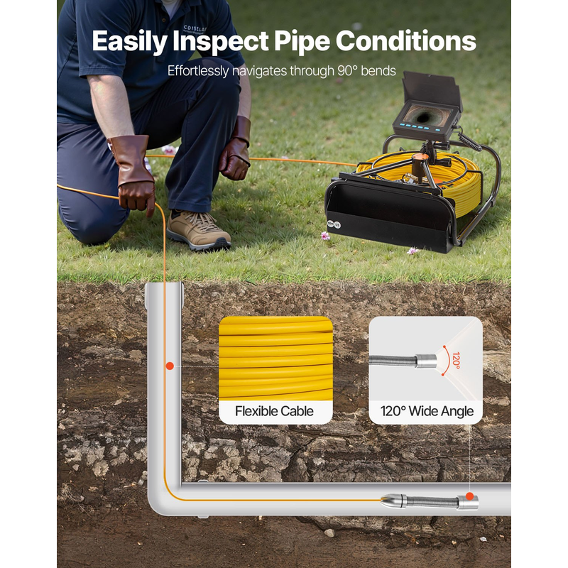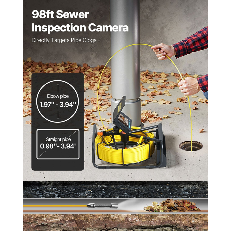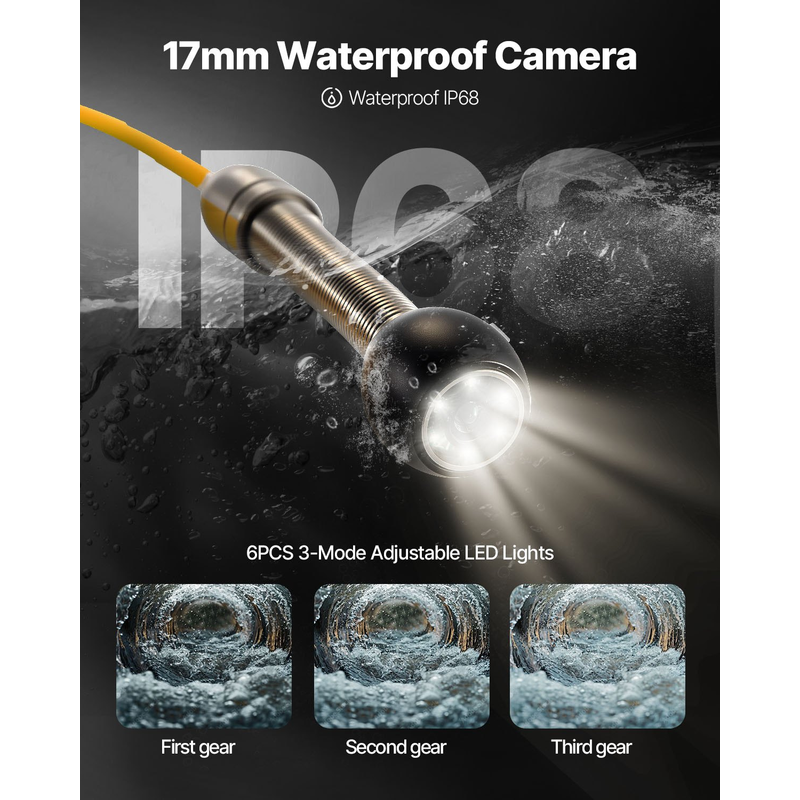 IP68 Waterproof Camera: The camera's diameter is 0.7"/17mm, compatible Pipe Diameters: Straight Pipes: 0.98 - 3.94 inch (25 - 100 mm); Right Angle Pipes: 1.97 - 3.94 inch (50 - 100 mm). The integrated and flexible spring of the camera enables it to make turns easily in the pipelines, especially in the ordinarily hard-to-reach areas.