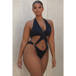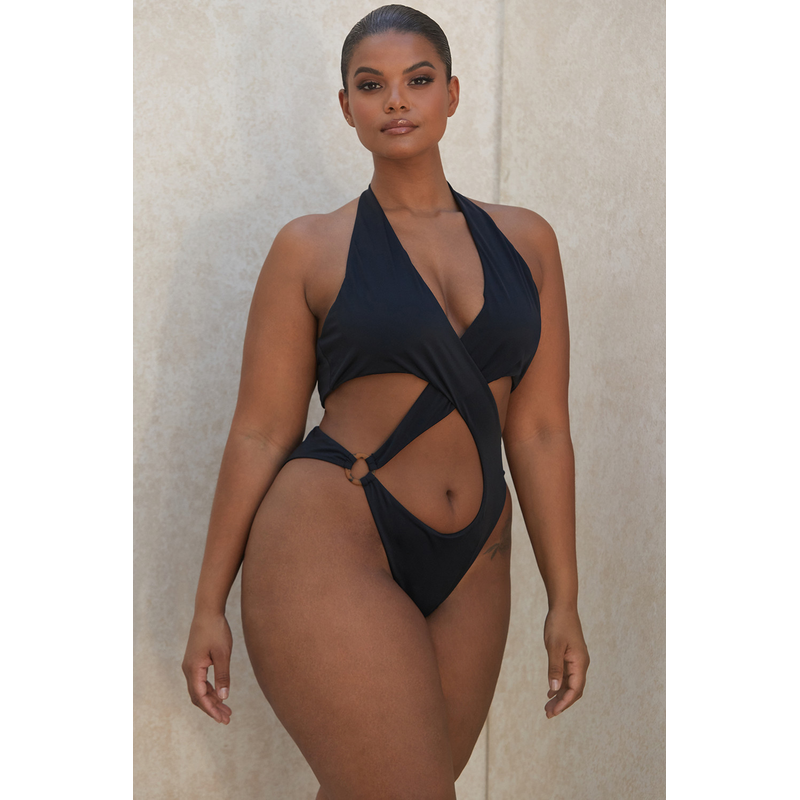 Sexy One-Piece Swimsuit Women's Solid Color Cross Hollow Large Size Bikini Bikini Swimwear Black 2XL