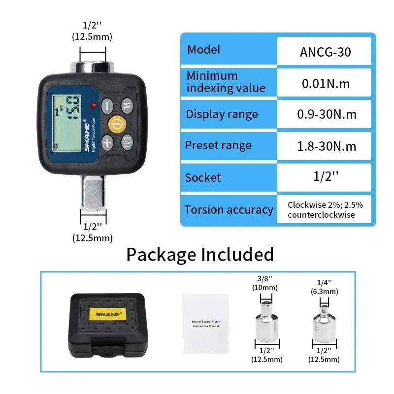 Digital display torque meter is a torque monitoring instrument matched with ratchet wrench, which is used for various fastening and disassembly control forces. It has the functionalcharacteristics of simple operation, portable carrying, multi-unit conversion, sound indication, forward and reverse adjustment, etc. It is widely used in automobile, bicycle, various mechanical maintenance industries, ete.