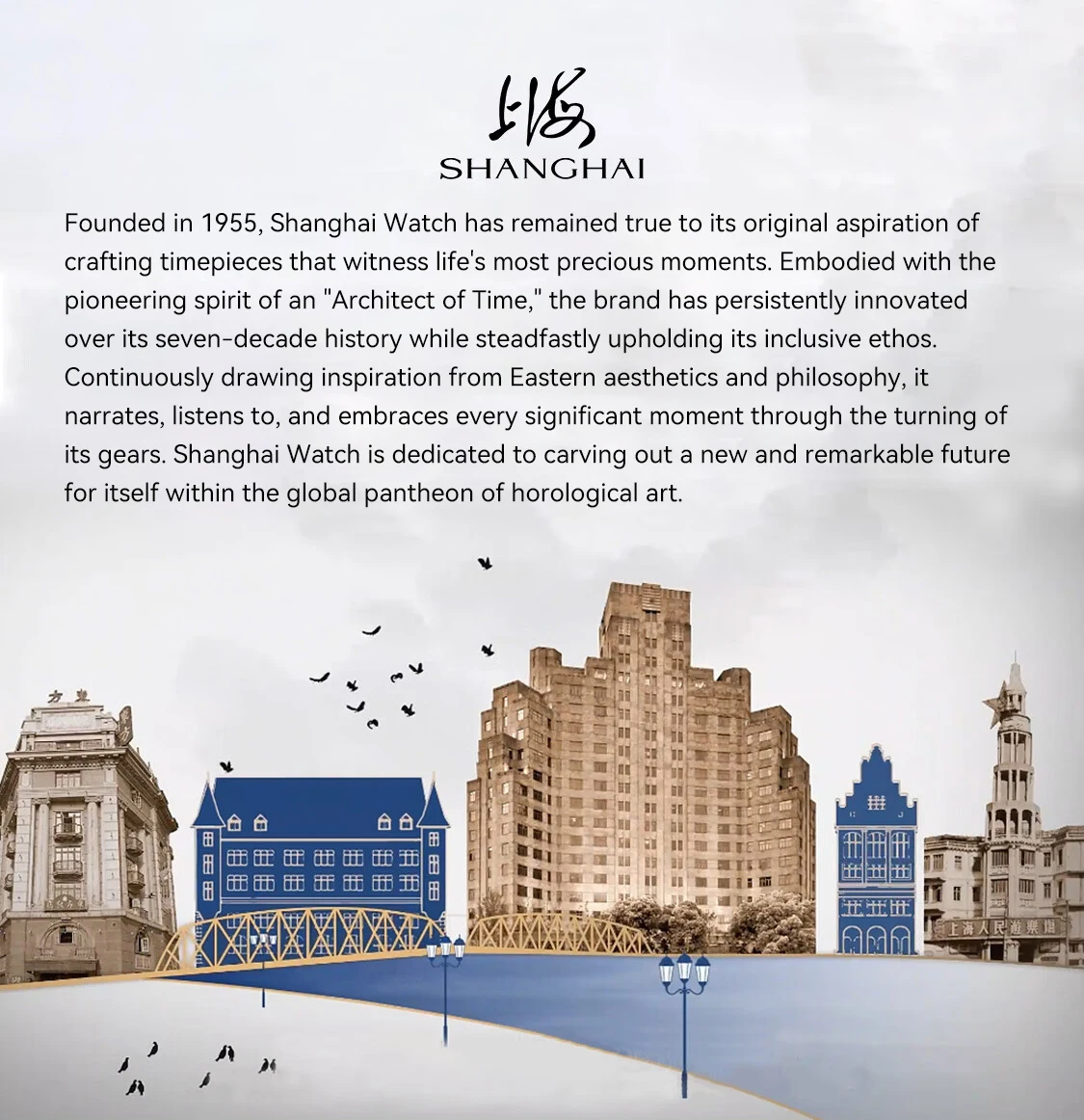 Founded in 1955, Shanghai Watch has remained true to its original aspiration of crafting timepieces that witness life's most precious moments. Embodied with the pioneering spirit of an "Architect of Time," the brand has persistently innovated over its seven-decade history while steadfastly upholding its inclusive ethos. Continuously drawing inspiration from Eastern aesthetics and philosophy, it narrates, listens to, and embraces every significant moment through the turning of its gears. Shanghai Watch is dedicated to carving out a new and remarkable future for itself within the global pantheon of horological art.