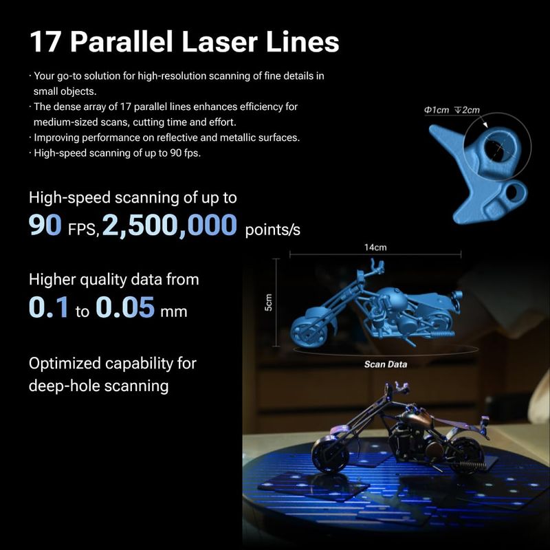 Hybrid light source with 17 laser lines - featuring 17 parallel blue laser lines, with a resolution of up to 0.05 mm and a scanning speed of 90 FPS - is ideal for efficiently capturing fine details, deep holes and medium-sized objects.