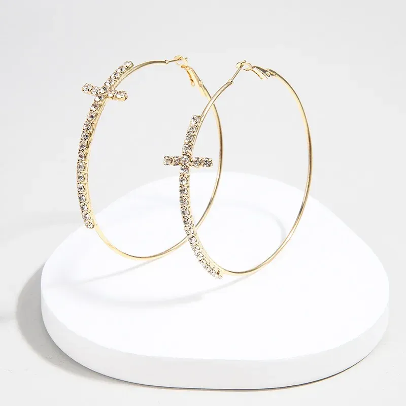 Shiny Big Circel Cross Hoop Earrings for Women Exquisite Rhinestones Ear Buckles Earrings High-end Geometric Ear Rings Jewelry