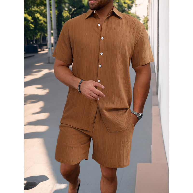 Shirt Casual Loose Short Sleeves Trousers Beach Suit Brown S
