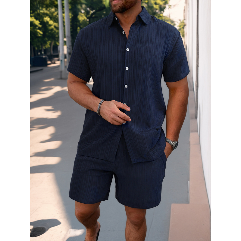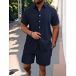 Shirt Casual Loose Short Sleeves Trousers Beach Suit Navy Blue S