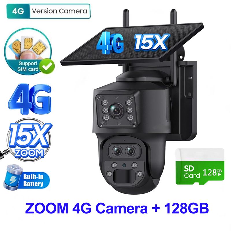 【15X Zoom & Dual-lens 360° Viewing Angle】Solar camera with 15X digital zoom, 4x optical zoom+3x digital hybrid zoom, allows you to clearly zoom in on distant objects(license plate number can see).supports 355 ° horizontal and 90 ° vertical rotation, can be easily controlled through an application to capture a wider range.