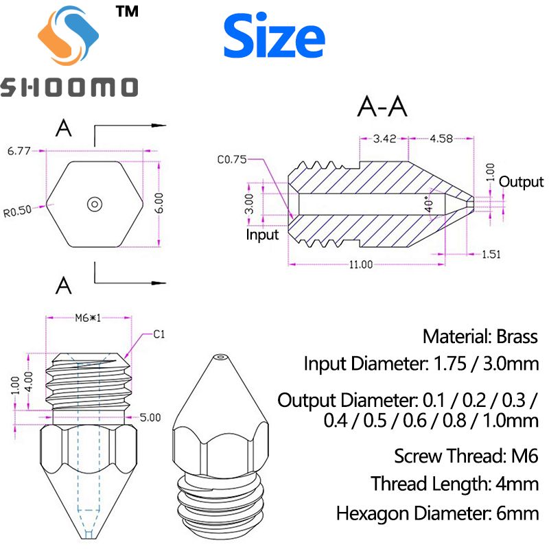 1. Full Size: Input diameter 2.00mm, Output diameter 0.4 mm, out thread M6, Thread length 4mm. And the outer surface is marked with a size, So you can easily identify the specifications of the nozzle.