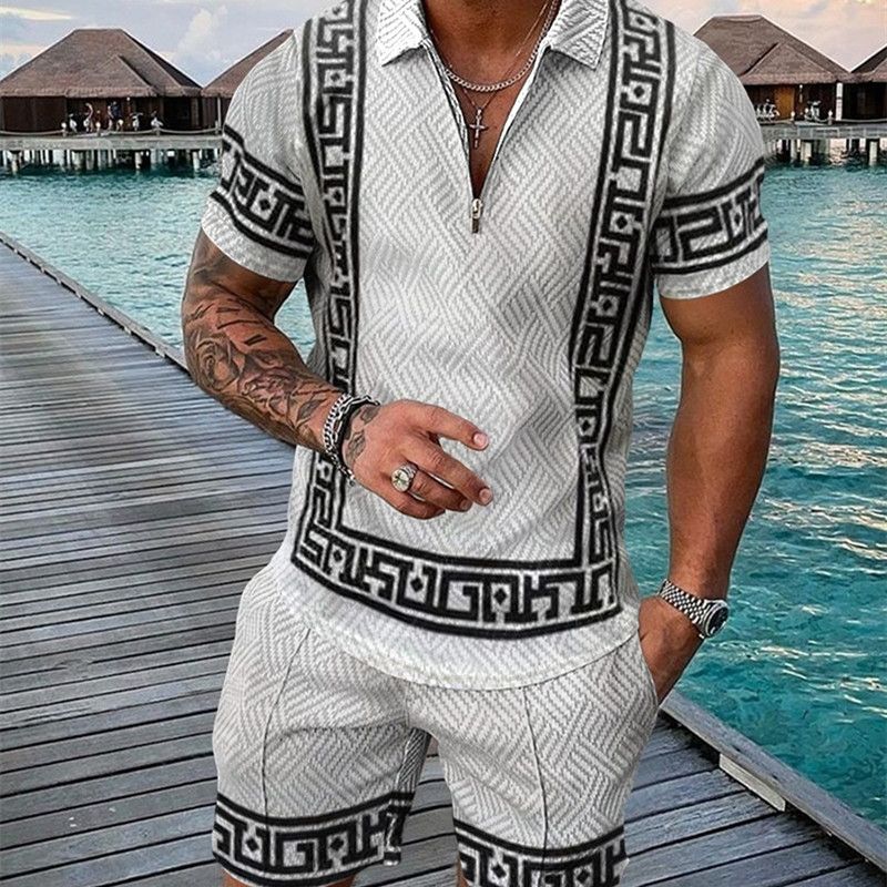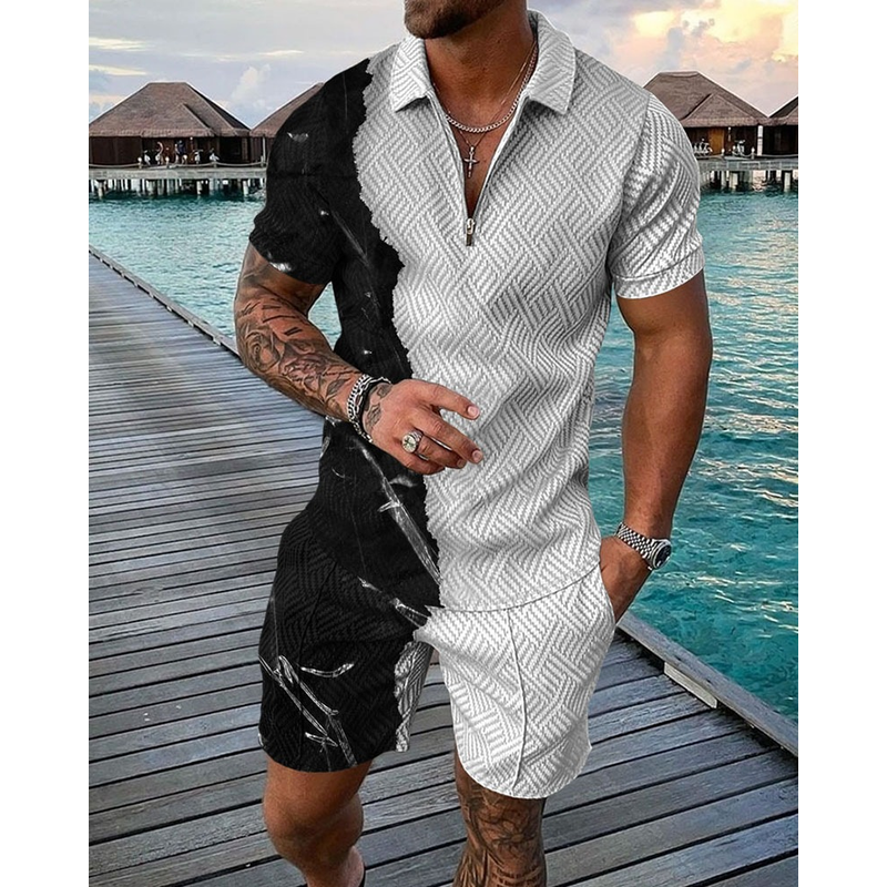 Short Sleeve Casual Striped Zip Polo Shirt White 4XL