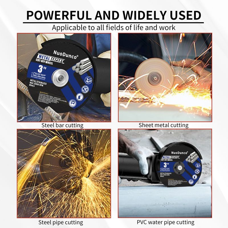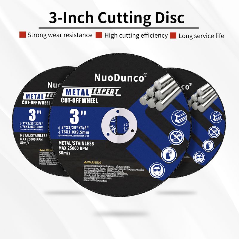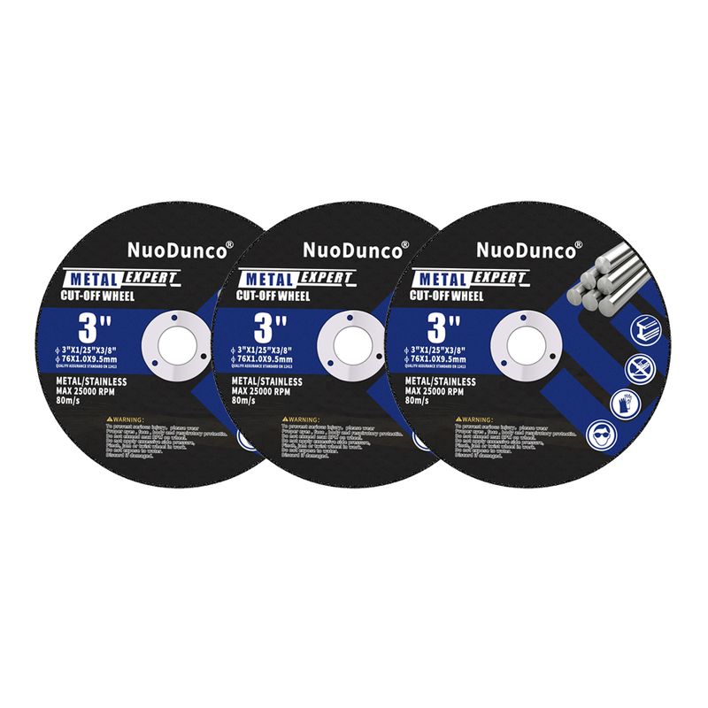 The 3 Inch Cut Off Wheel features a metal center and design of 1mm thickness cutting off wheels provides fast, precise, and clean cutting performance with minimal burrs and material waste. The cutting disc for metal & stainless steel meet ANSI safety requirements.And operating speeds up to 25000 RPM and 80M/S.