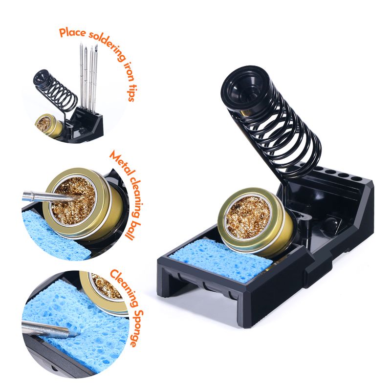 5.Multifunctional soldering iron holder, equipped with metal cleaning ball and cleaning sponge,Can be installed on the top of the machine to save space