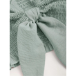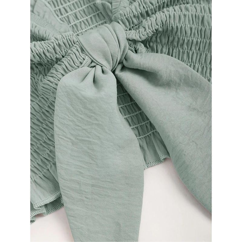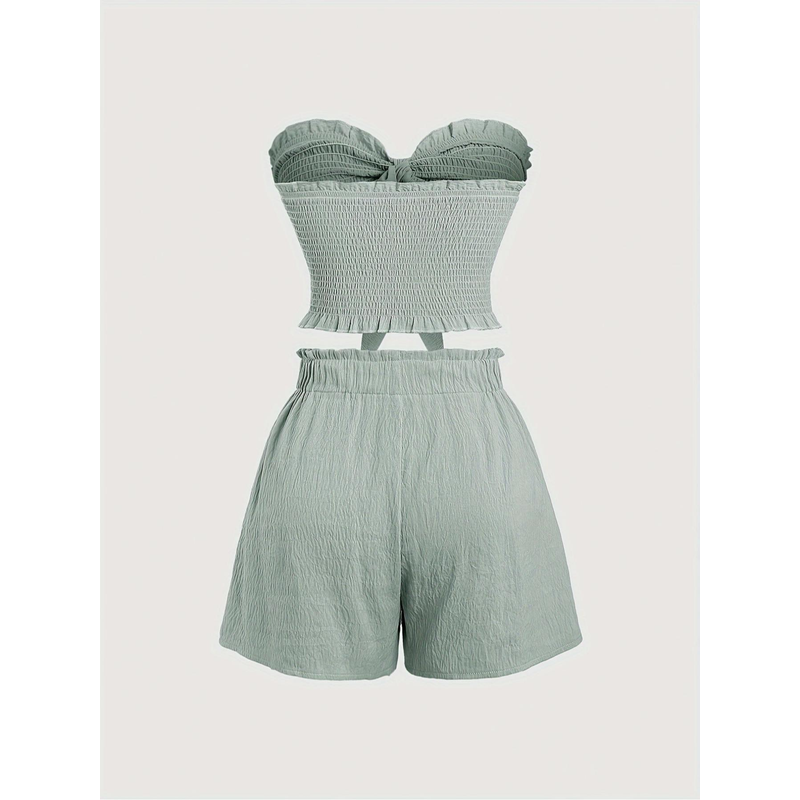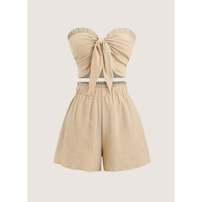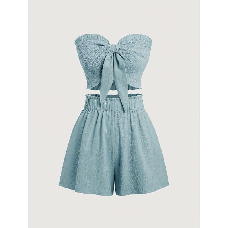 Simple, beachy style, romantic seaside. Date outfit featuring a top with gathered details and shorts, a two-piece set for women.
