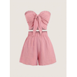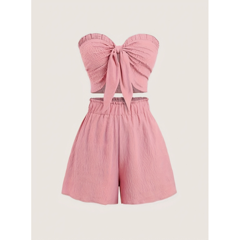 Simple, beachy style, romantic seaside. Date outfit featuring a top with gathered details and shorts, a two-piece set for women.