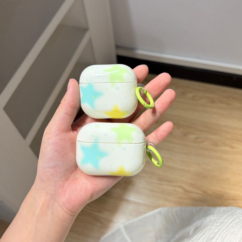 Simple Lovely Three Colorful Stars Pattern Protective Earphone Case with Green Rings Cover for AirPods 1 2 3 4 Pro 2 Pro 3