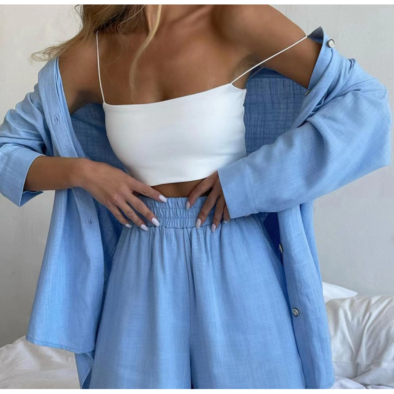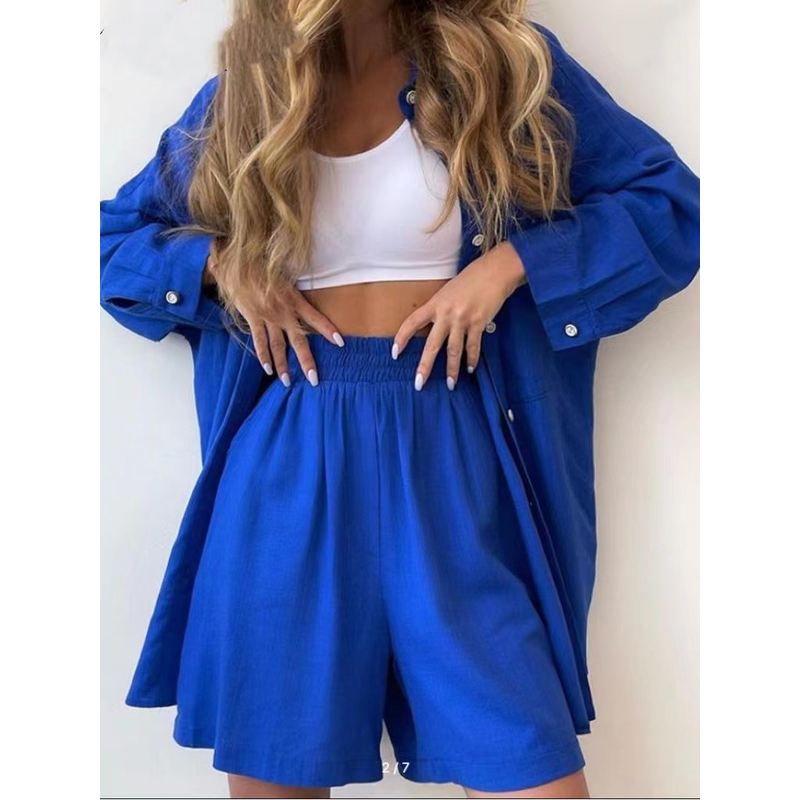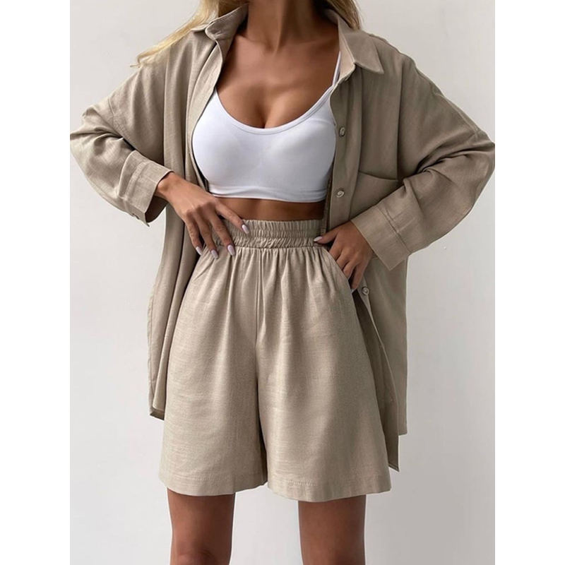Single-breasted Long Sleeve Shirt Loose Casual Shorts Suit Orange Red S