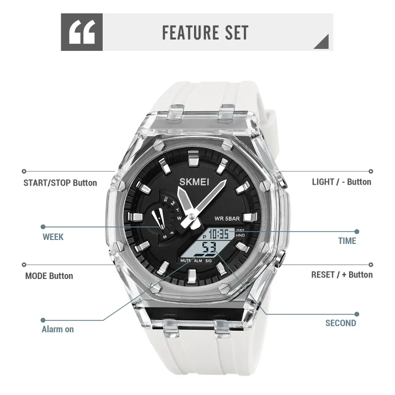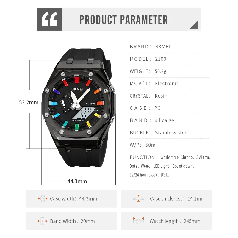 SKMEI 2100 Waterproof Men Watch Countdown Stopwatch Led Light Electronic Movement Wristwatch 5Alarm Clock 2 Time Digital Watches