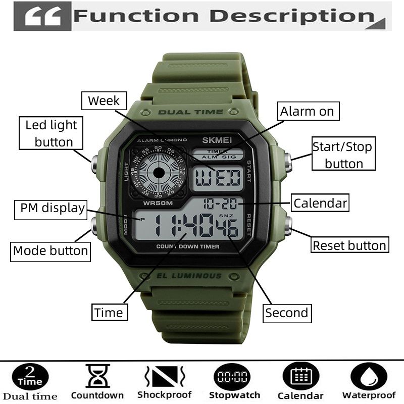 ▪ Function: Dual Time Zone, Chronograph, 5 ATM Waterproof, Calendar, Led light, Date, Week, 12/24 Hour format, Alarm clock, Stop Watch