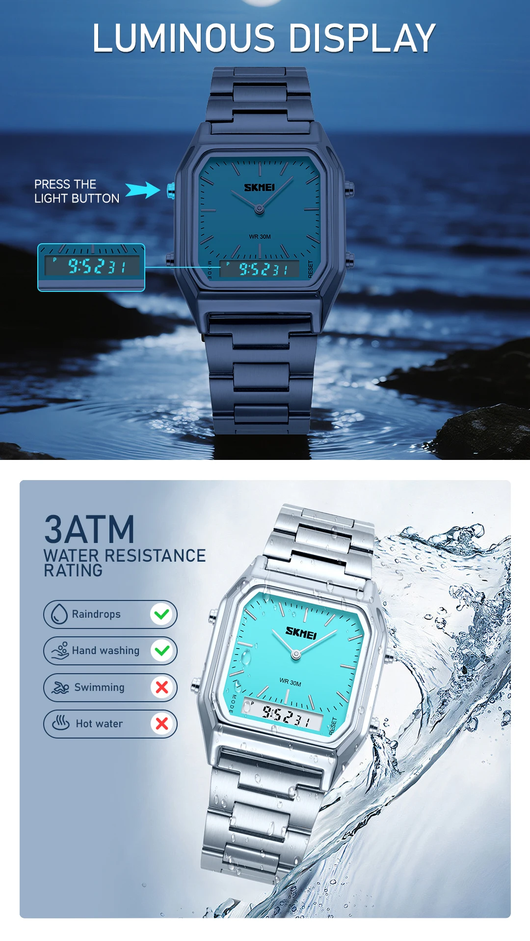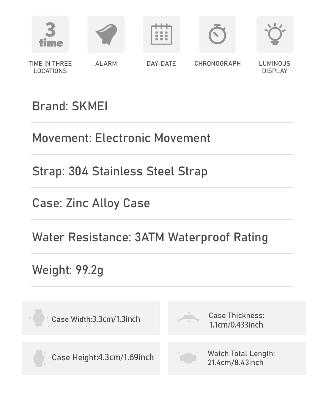 8.Function:3 time, Alarm,Date, chronograph,Luminous Display.